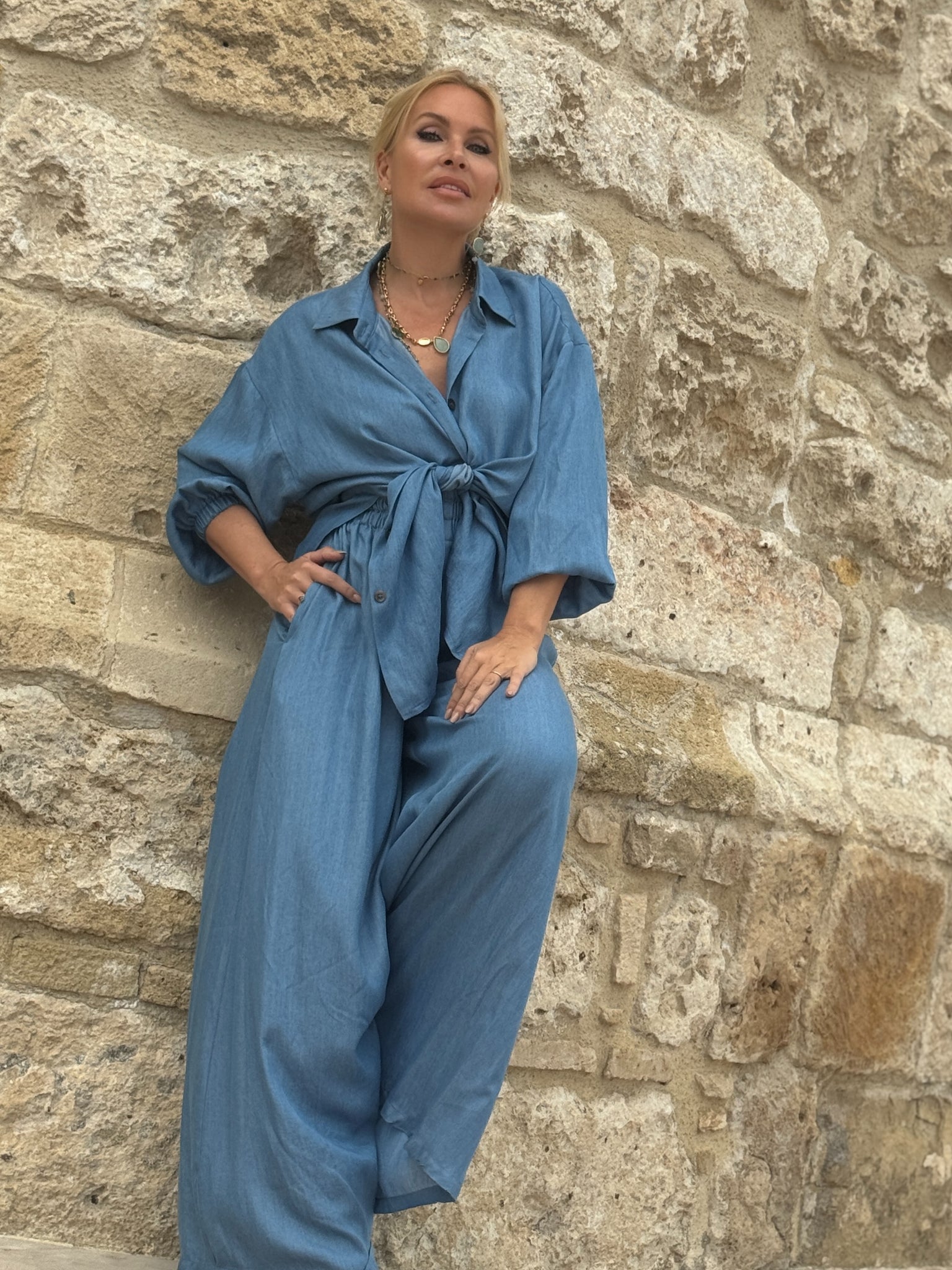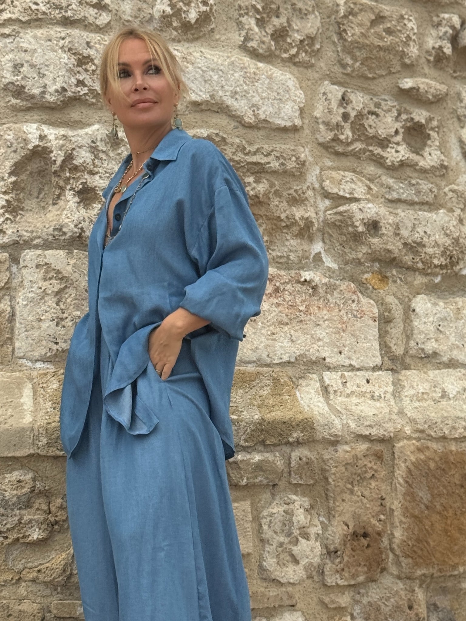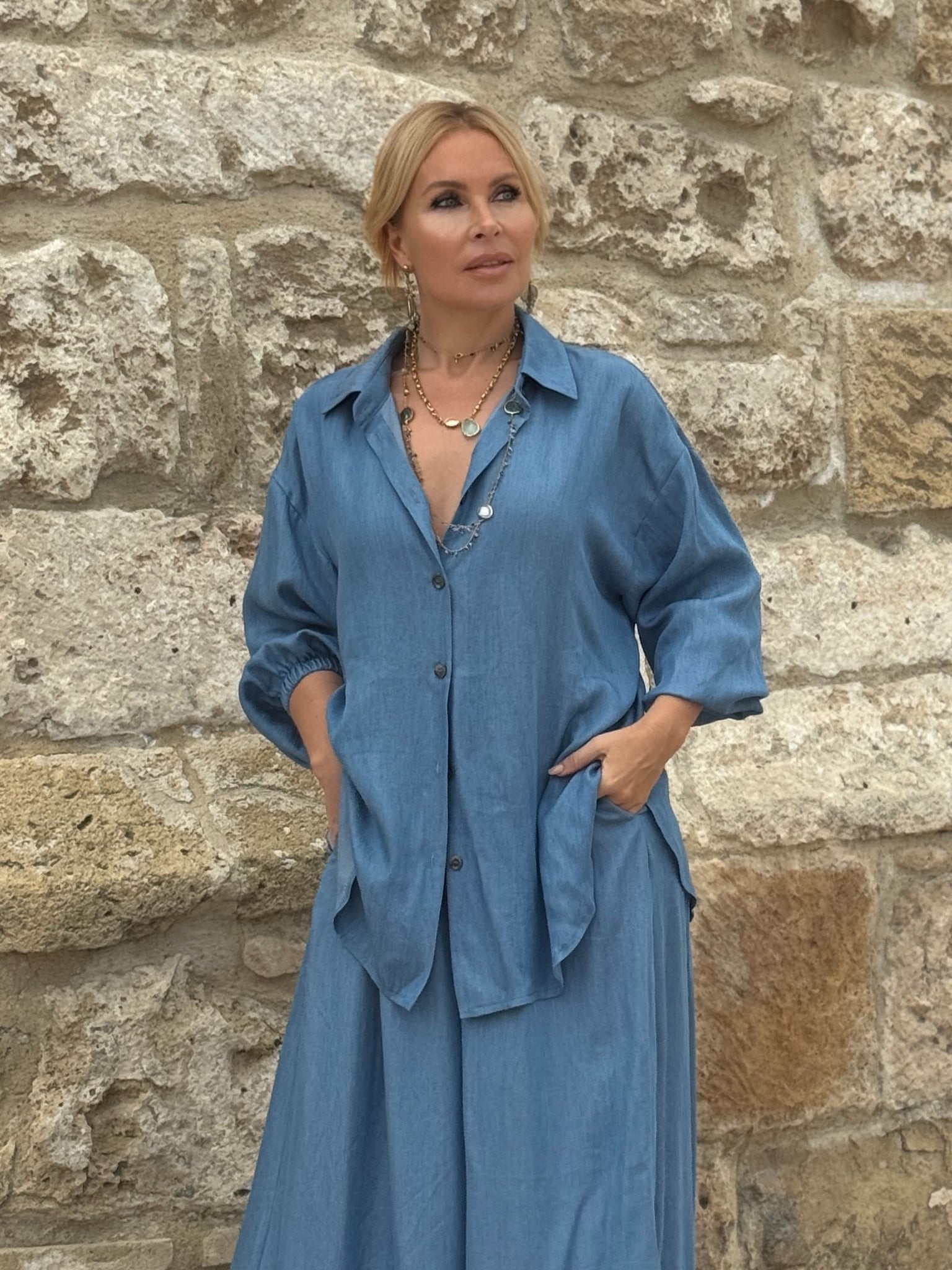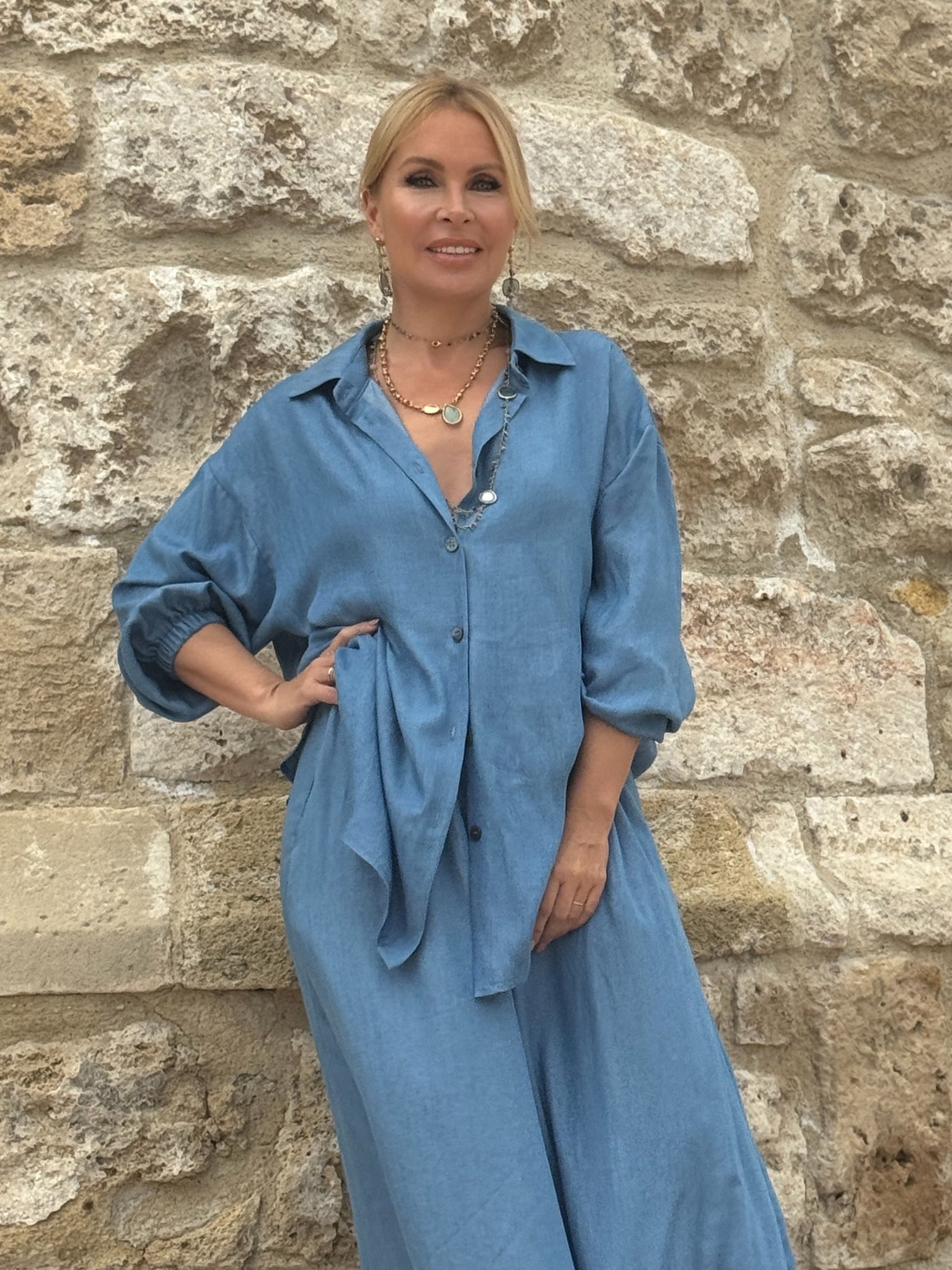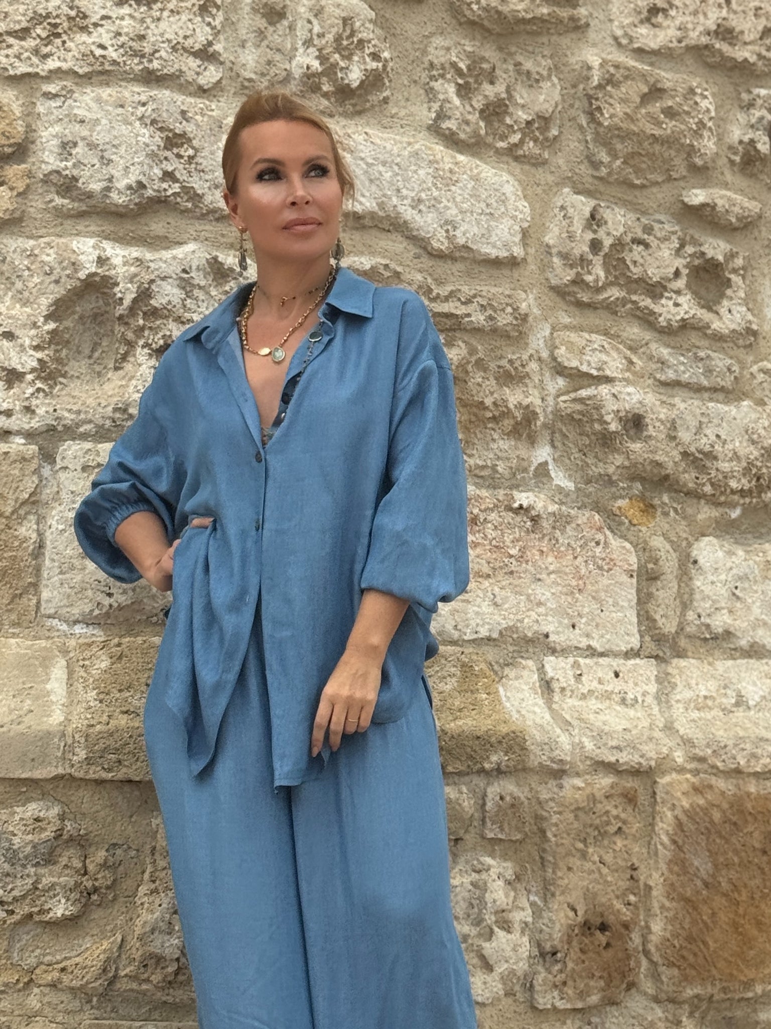 Koszula o luźnym kroju, opadającej linii ramion i obszernych rękawach. Zapinana z przodu na guziki . Dół podkrojony na pòłokrągło, dzięki czemu optycznie wysmukla , i świetnie układa się podczas związania przodów w supeł.