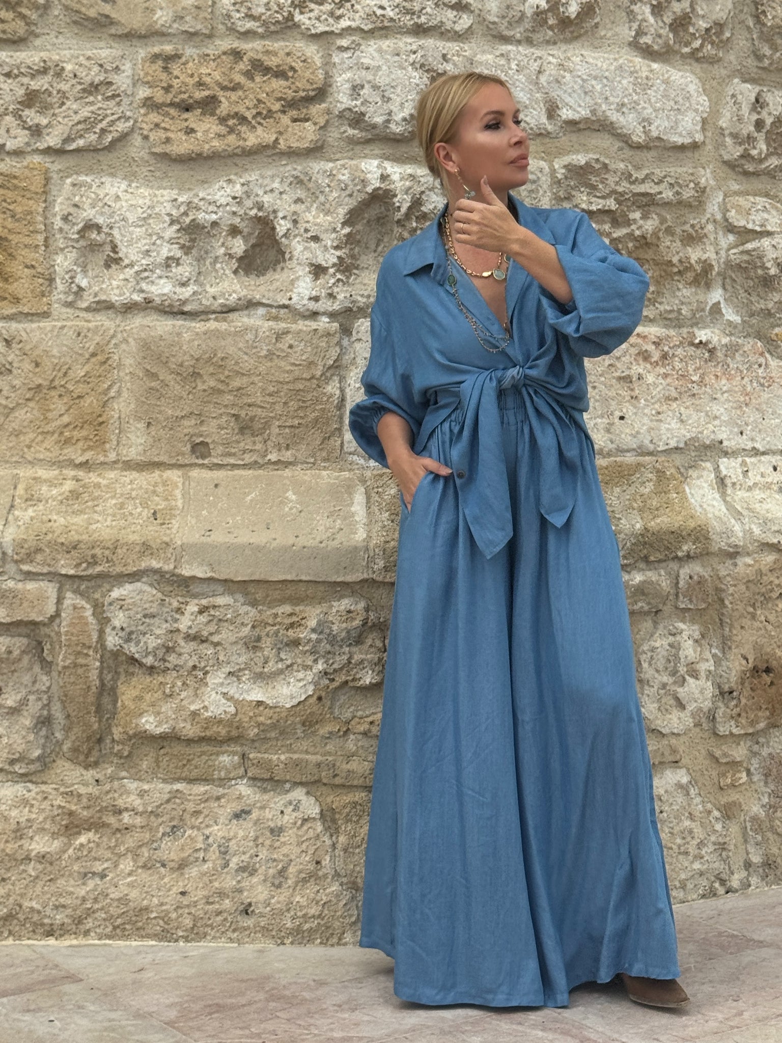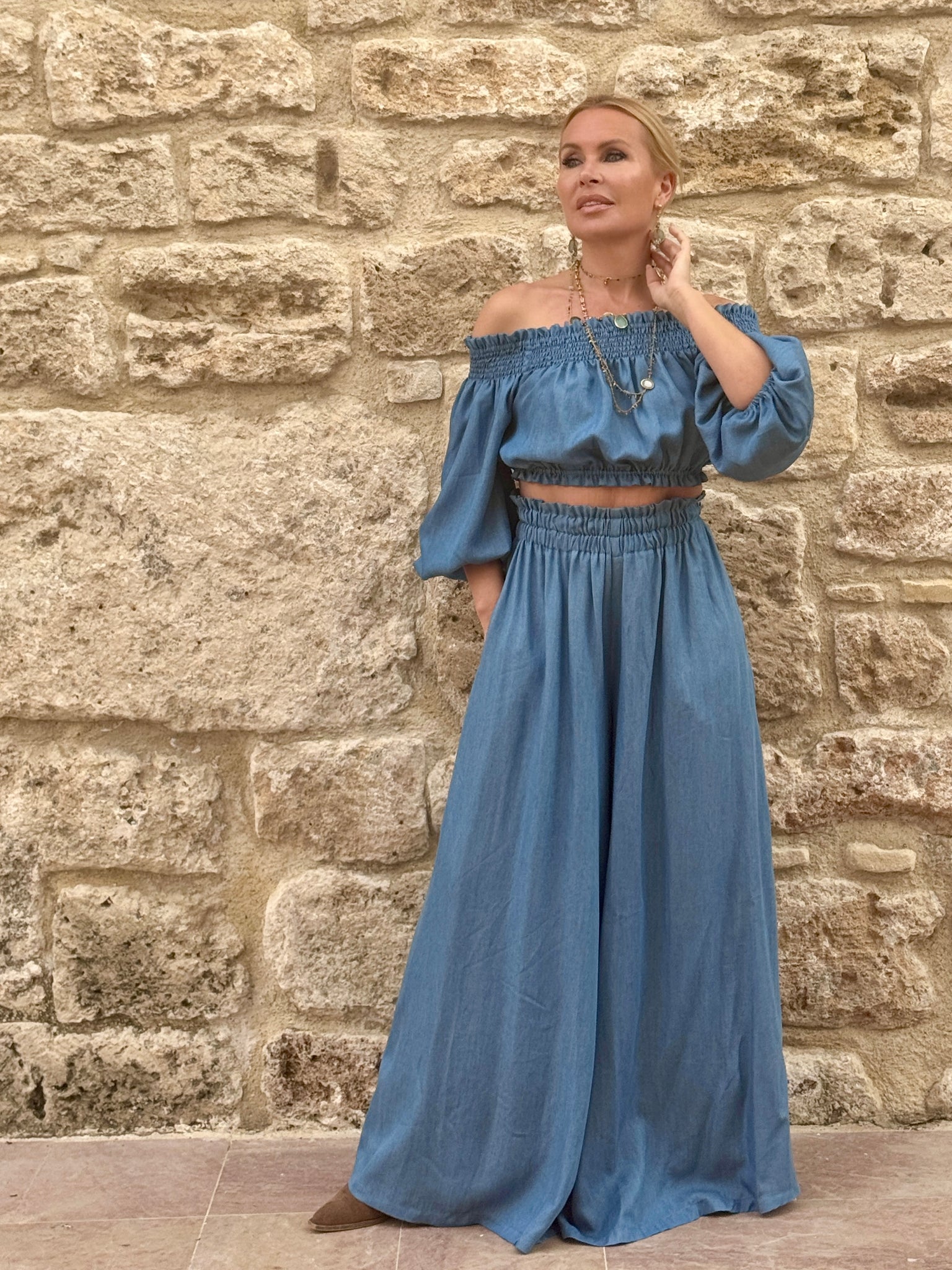 Spodnie, prawie spódnica z klosza :) Ten wyjątkowy efekt powstał przez nietypowe skrojenie nogawek, z ekstremalnie rozszerzoną nogawką. Nie są to klasyczne dzwony, poniewaz nogawki rozszerzają się już od bioder, dzięku czemu spodnie miękko „ opływają „ sylwetkę. Elastyczna talia i boczne kieszenie zapewniają maksimum wygody.