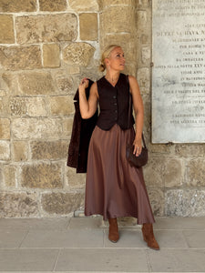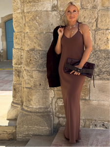 SLIP MAXI DRESS/ chocolate brown and caramel print with golden thread
