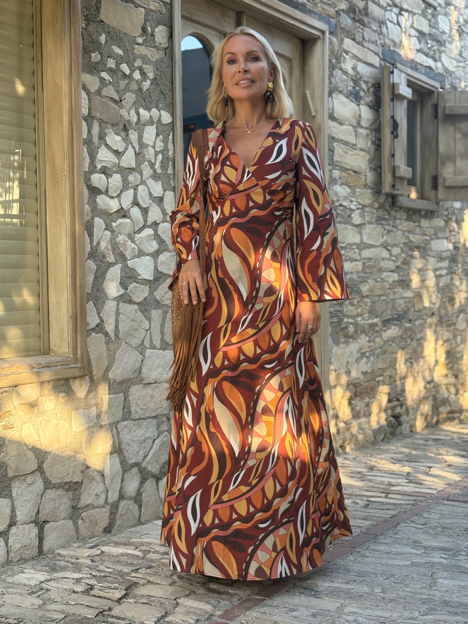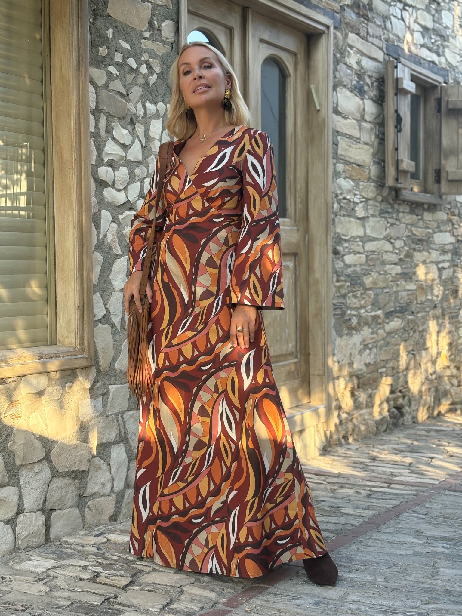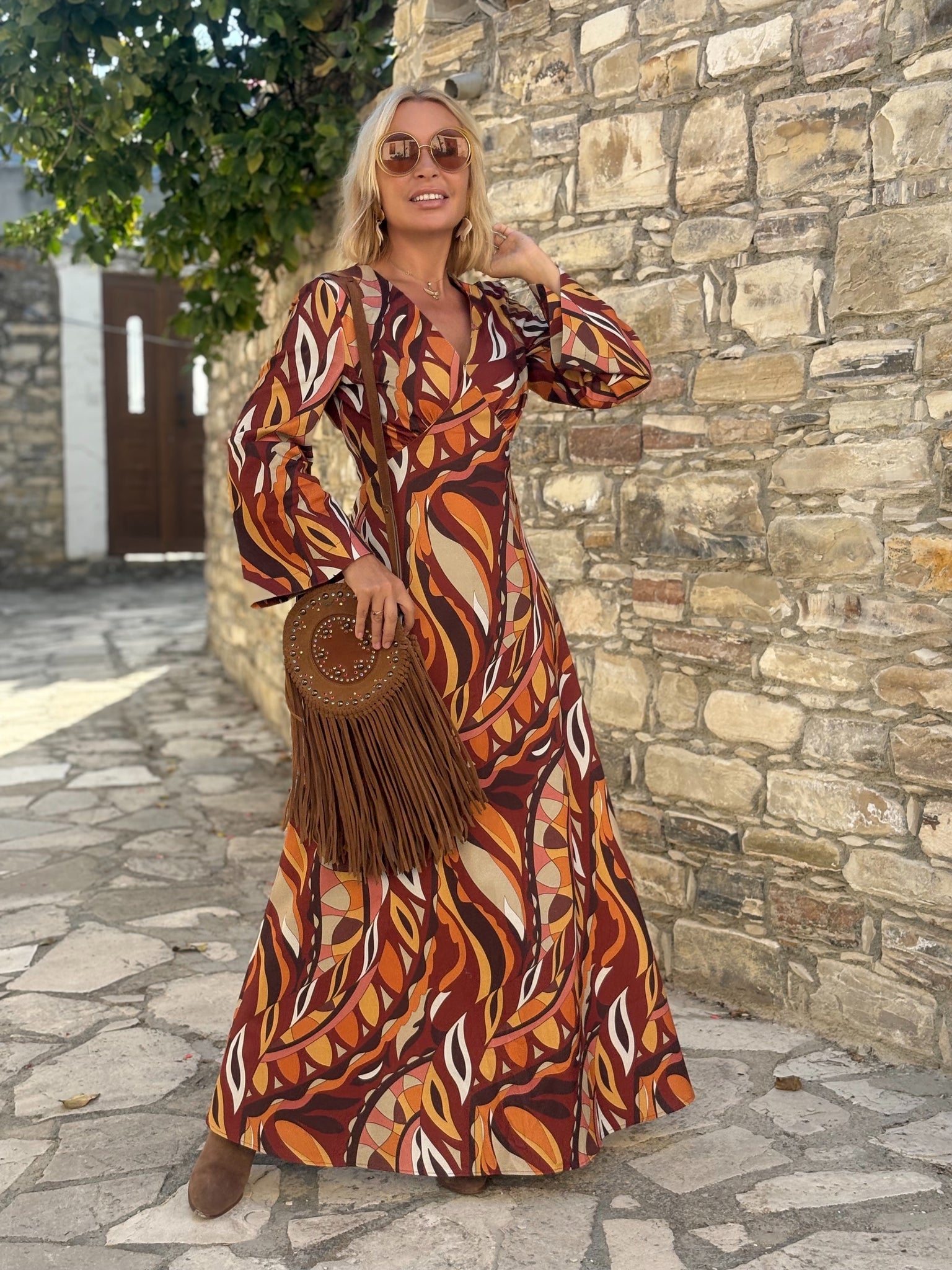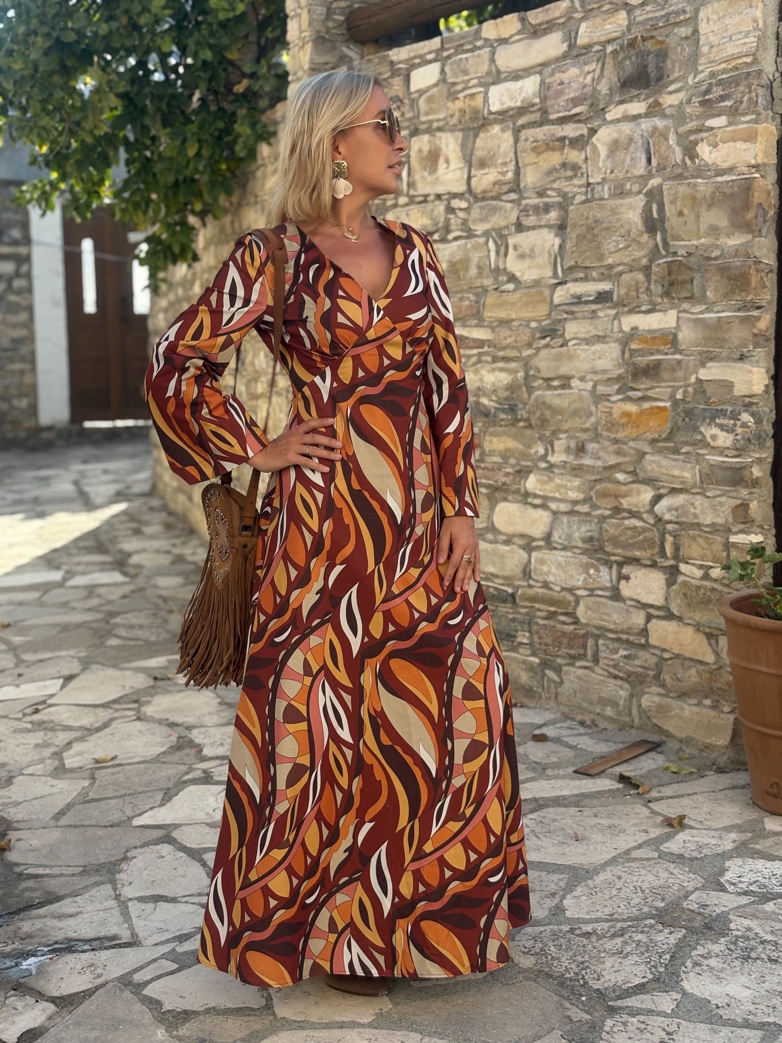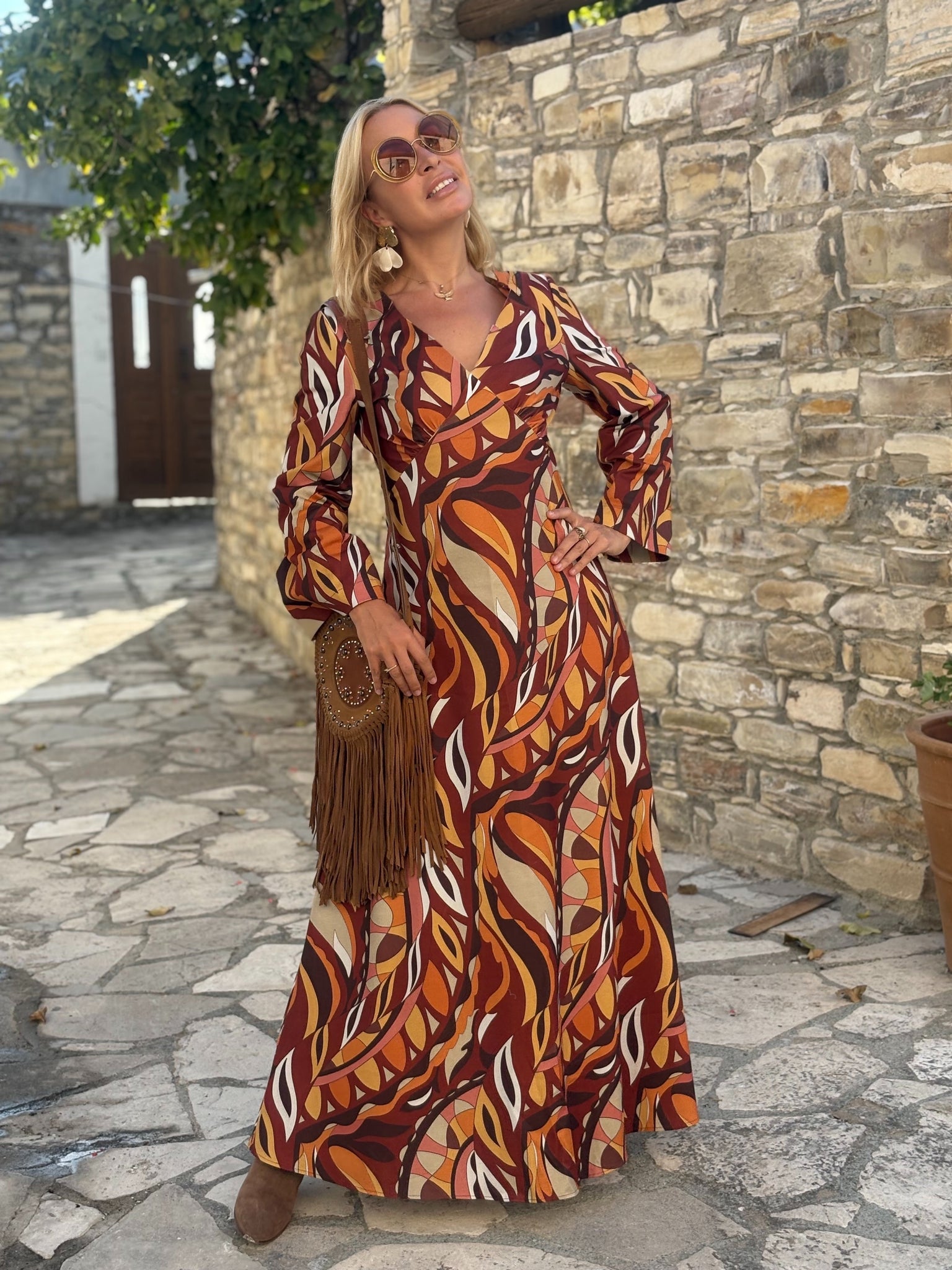 Stylowa suknia nawiązująca do mody późnych lat 60tych. Smukła linia podkreśla figurę, dzięki włóknom elastycznym sukienka pięknie dopasowuje się do ciała. Dopasowana w talii, łagodnie rozszerza się ku dołowi w stylową formę litery “A”. Dekolt V i piękny podkrój pod biustem idealnie modelują sylwetkę. Z tyłu zapięcie na zamek błyskawiczny. Brak podszewki. Rękawy długie, rozszerzane.