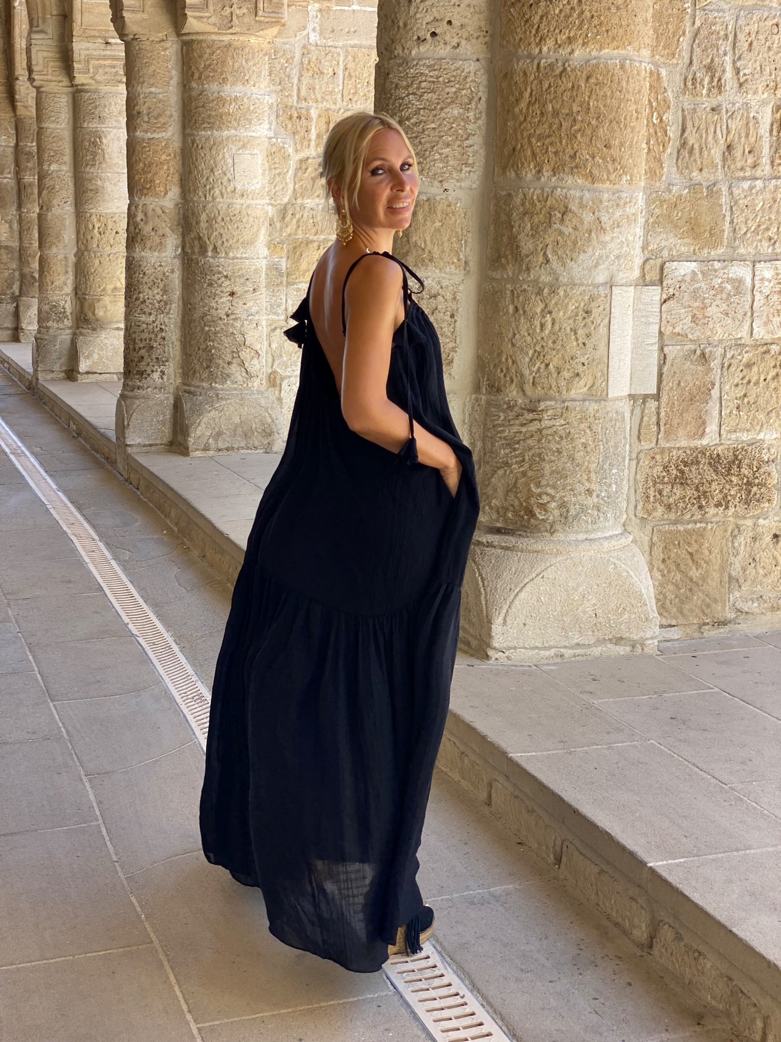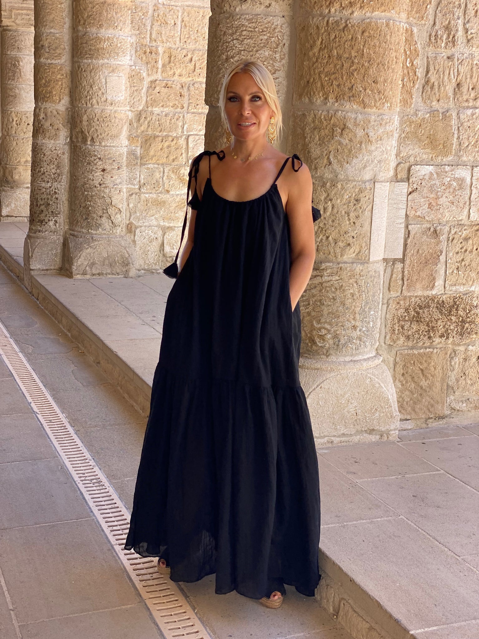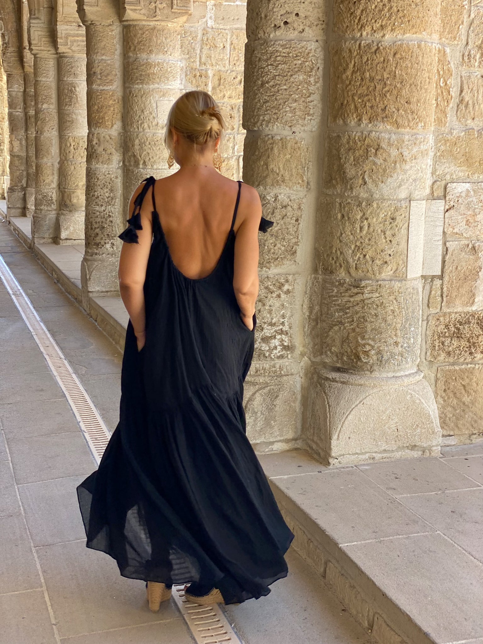BAGGY-Jaroszewska brand’s iconic maxi dress, with an exposed open back, and long strings making it easy to adjust . Strings finished with characteristic handmade tassels The loose cut emphasizes the sexy bodyshape by exposing the back. The top of the dress is cut from double layer of fabric. The wide and long ( 70 cm) ruffle on the bottom of the dress creates an impression of flawlessness and volume with every move. Now, “ Baggy” dress has also two side pockets- so chic, so nonchalant!