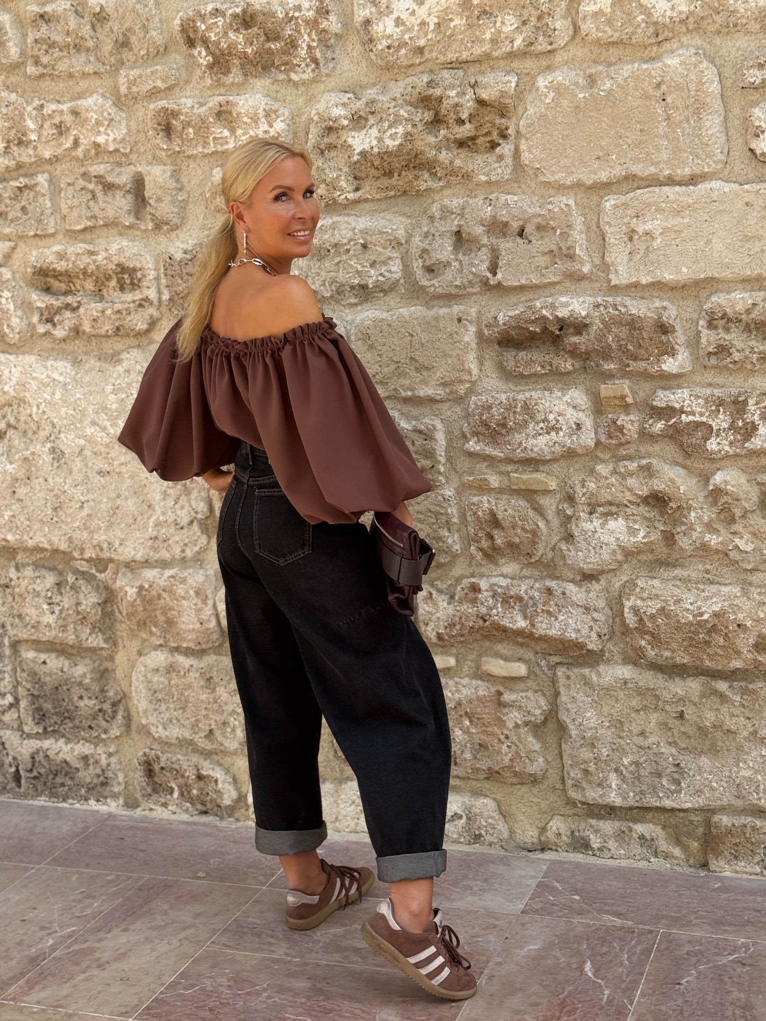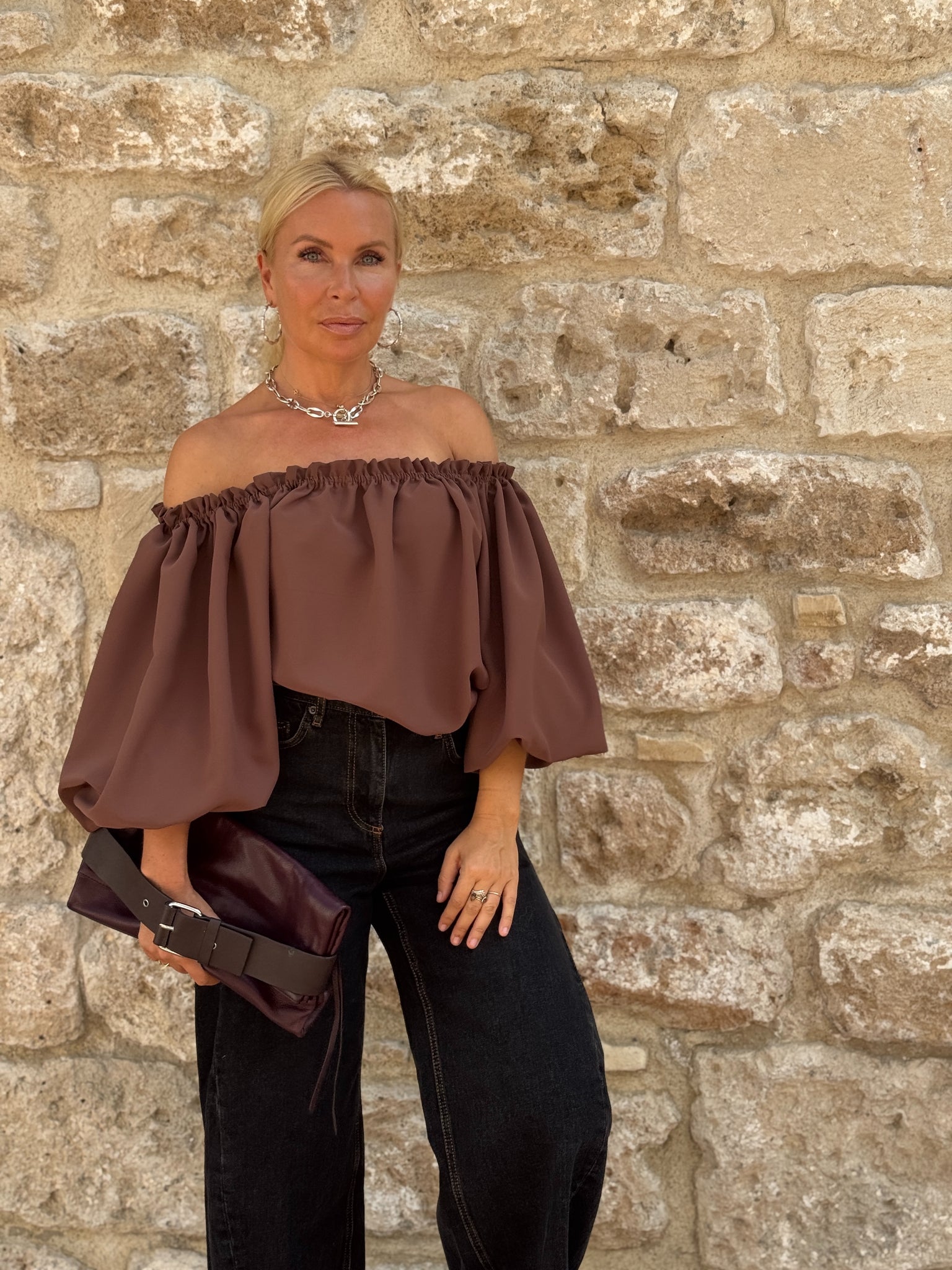 CARMEN a loose blouse with a Spanish style decolletage highlighting the shoulders and wide open sleeves. The balloon sleeves make a wow effect thanks to extraordidary volume , each one is 130 cm wide. This beautiful shape looks great loose as well as with the belt.