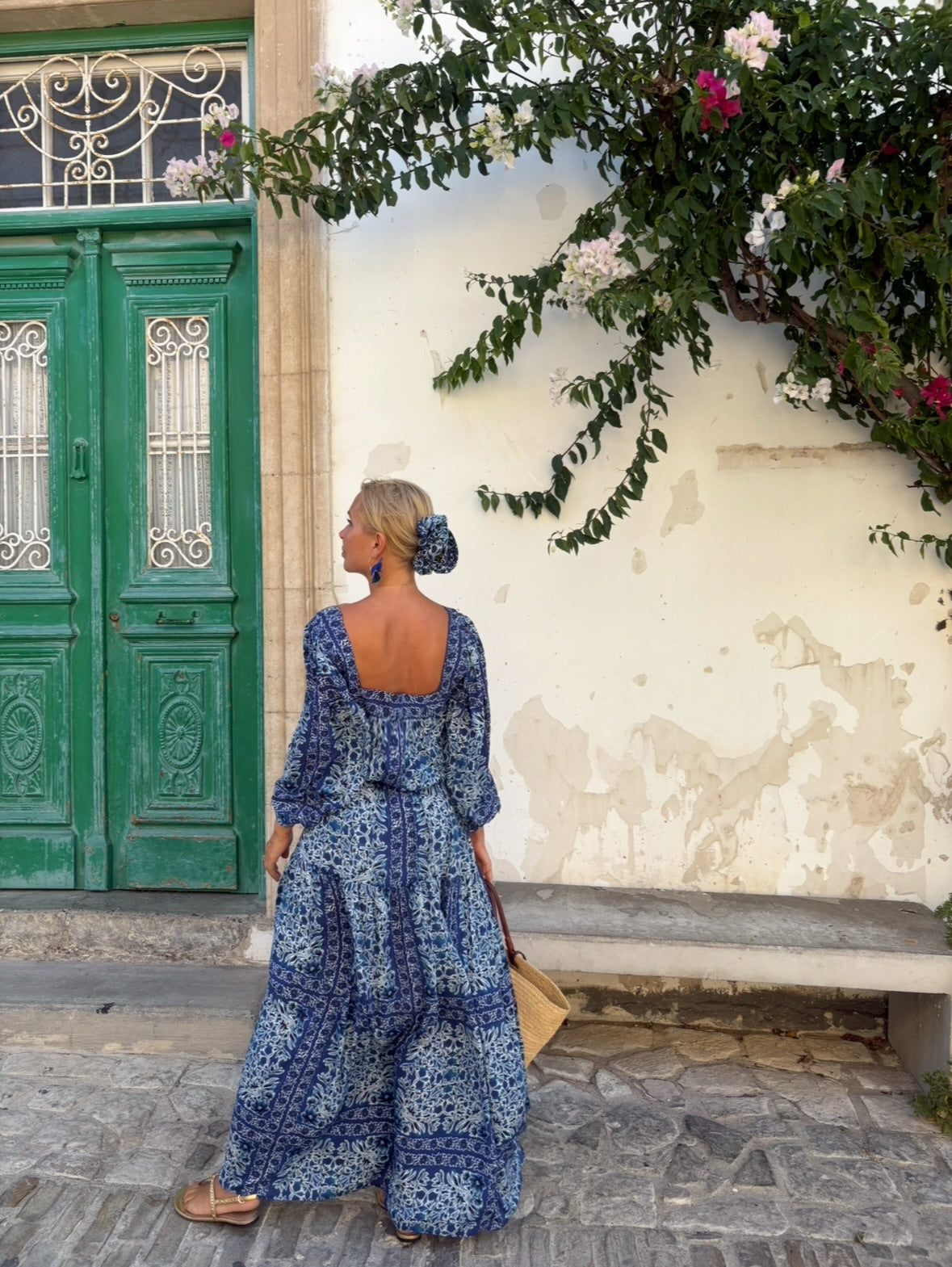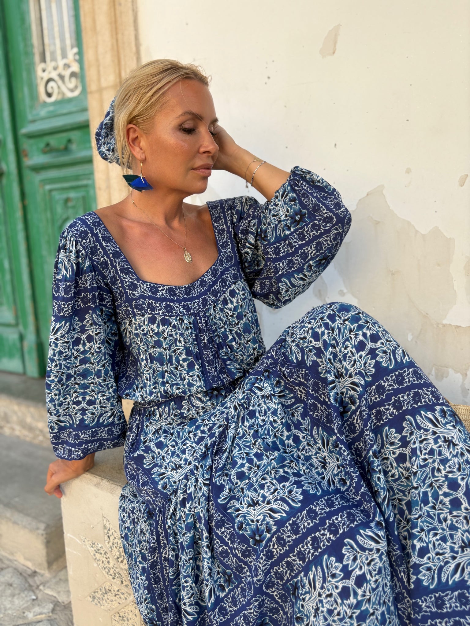 CARO- sukienka maxi z oryginalnym dekoltem caro, którego geometryczną formę podkreśla ornament tkaniny. Kwiatowy wzòr tworzy ozdobną ramę dekoltu. Sukienka ma podkreśloną, elastyczną lonię talii , spòdnicę z 6 metrową falbaną oraz rozszerzane rękawy w stylu bell sleeve.