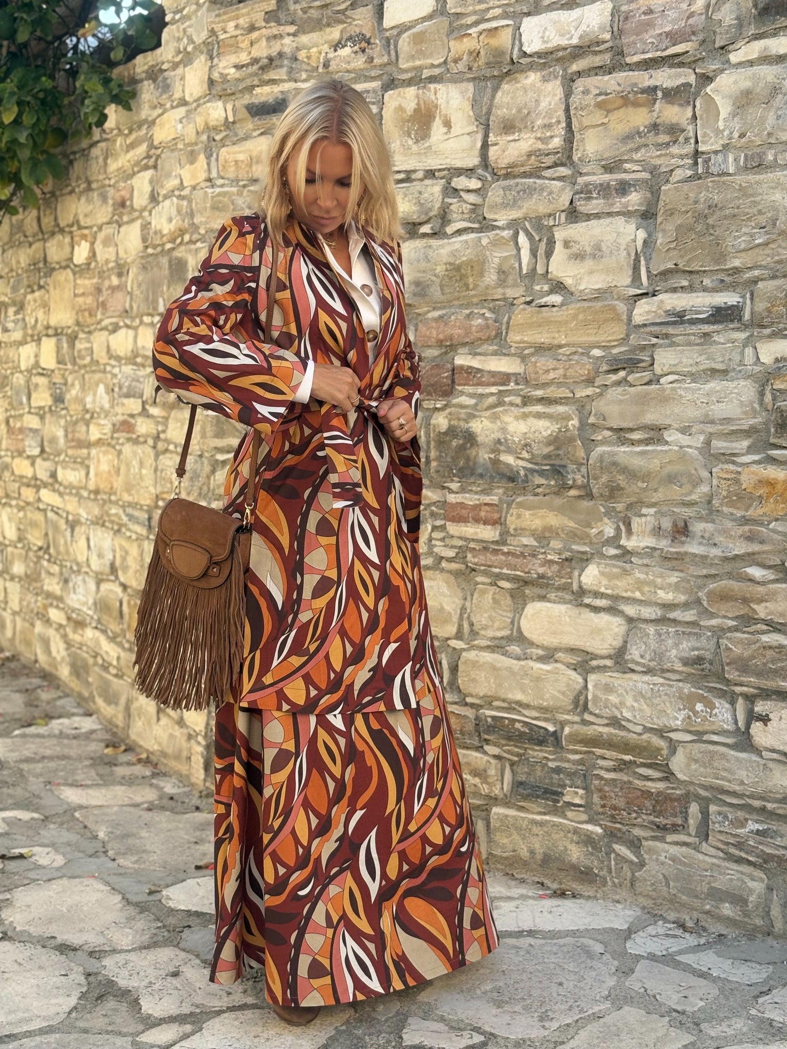Spódnica o perfekcyjnie rozszerzanej linii “A” nawiązuje do mody lat 60 tych i podkreśla dekoracyjny wzór tkaniny . Lekko sztywny denim pięknie układa się w tej szlachetnej gormie, a dzięki włóknom elastycznym spódnica dopasowuje się do ciała. Zapinana z tyłu na zamek błyskawiczny. Brak podszewki.