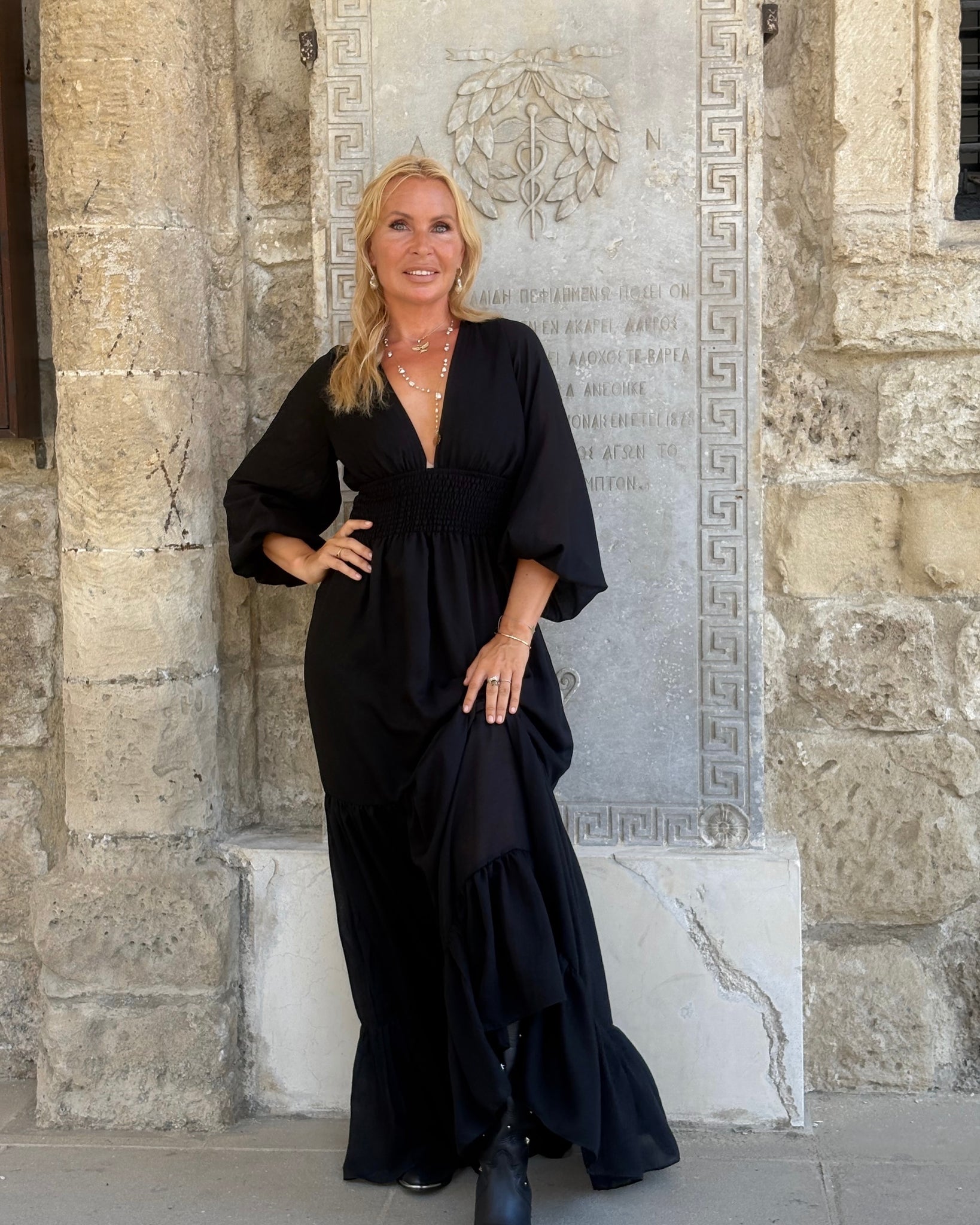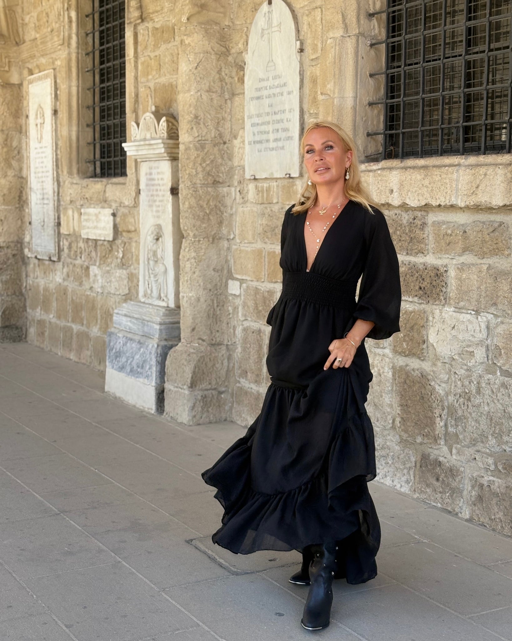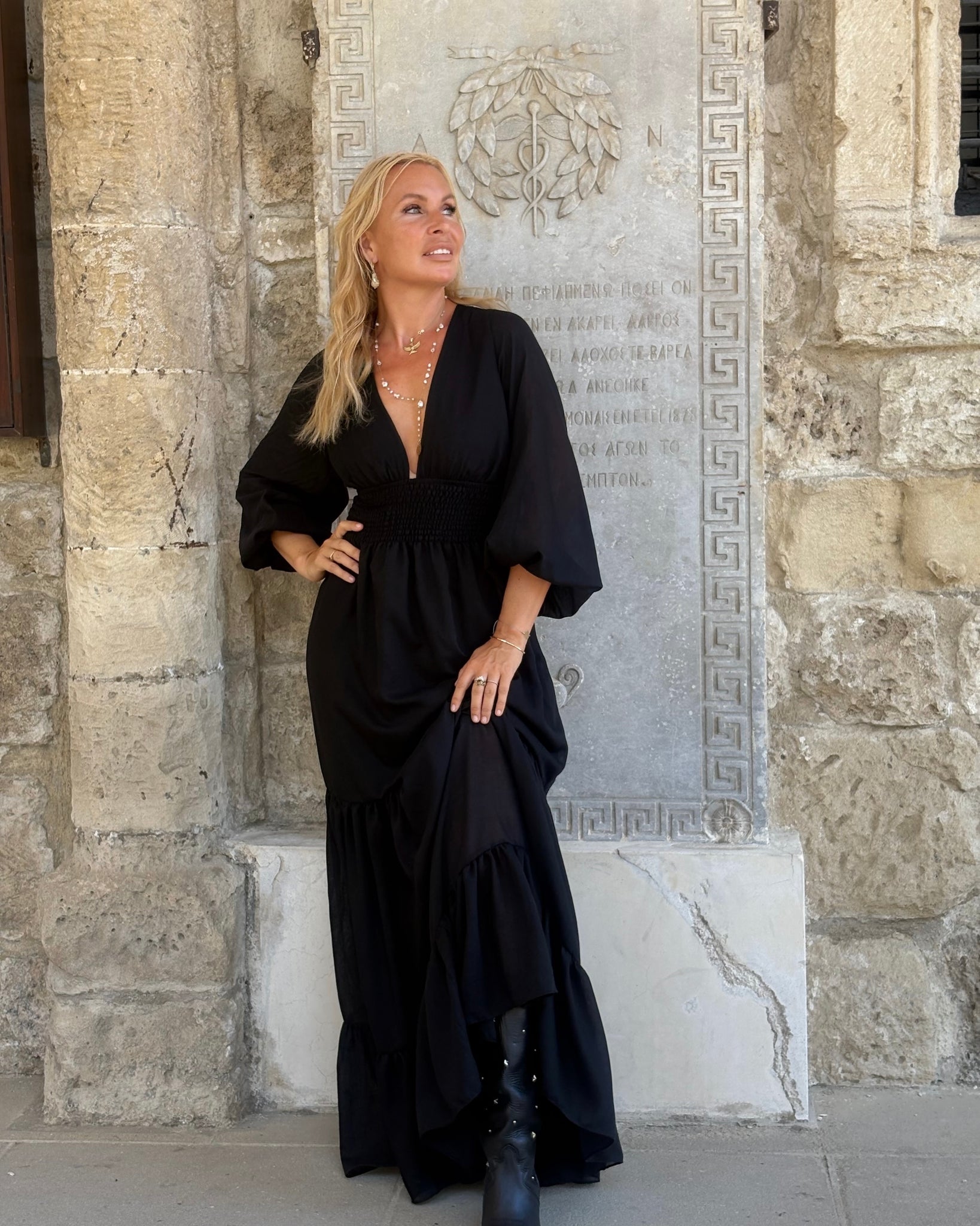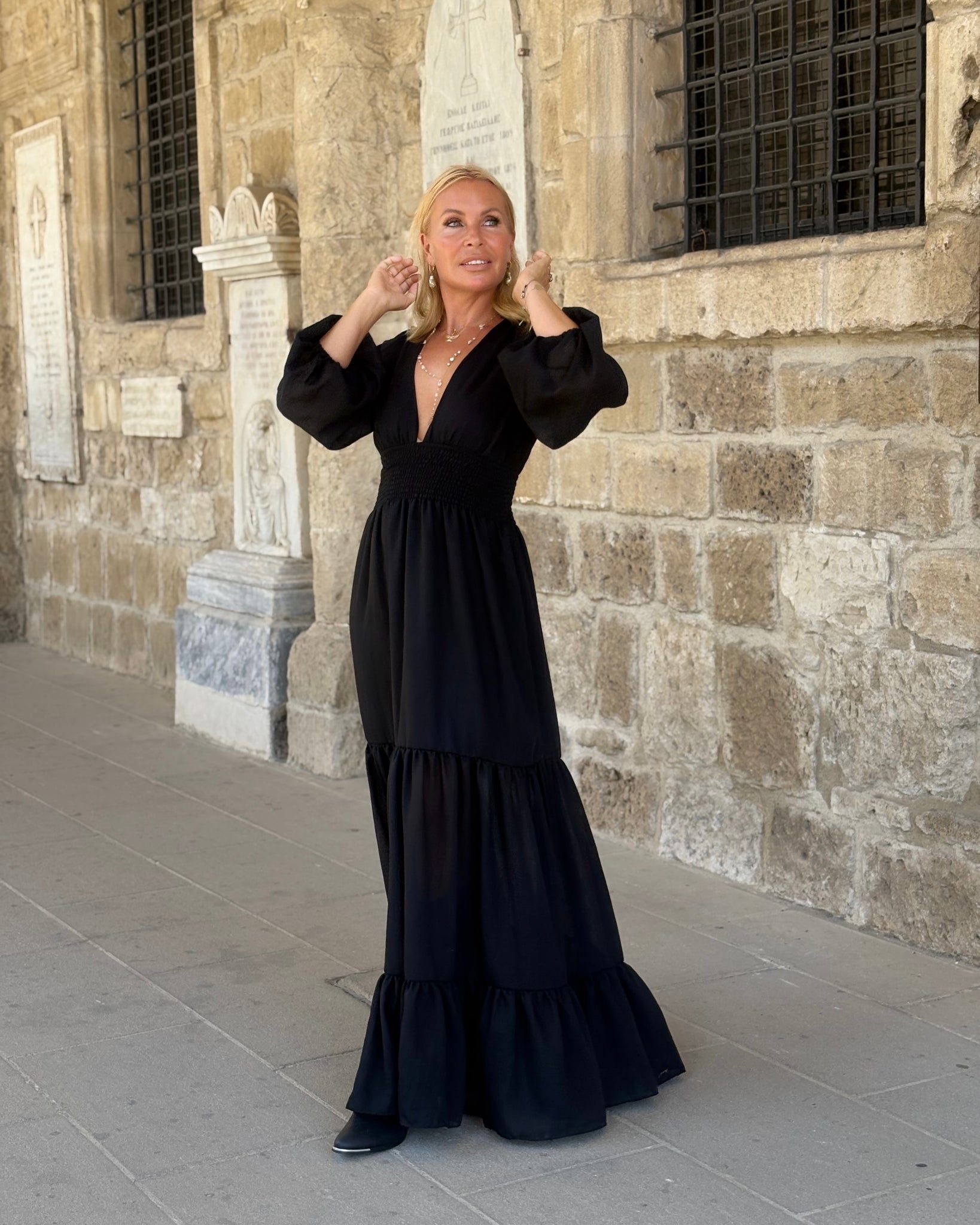 HIPPIE is one of the trademark dresses of the Jaroszewska brand. Characteristic style with a deep V neckline, high and elastic waistline, long, flared sleeves with elastic finish and flowy maxi skirt with ruffles ( bottom one with 6 mtrs circumference) gives off a romantic , impressive look inspired by 70’s boheme chic.