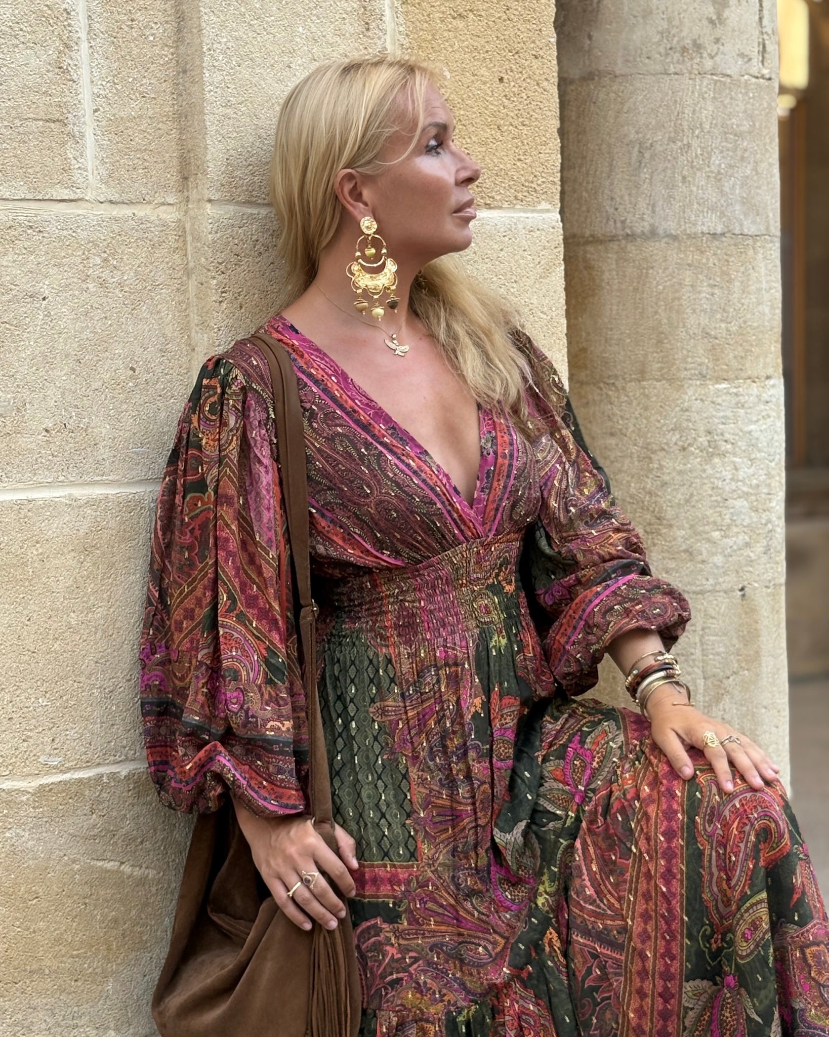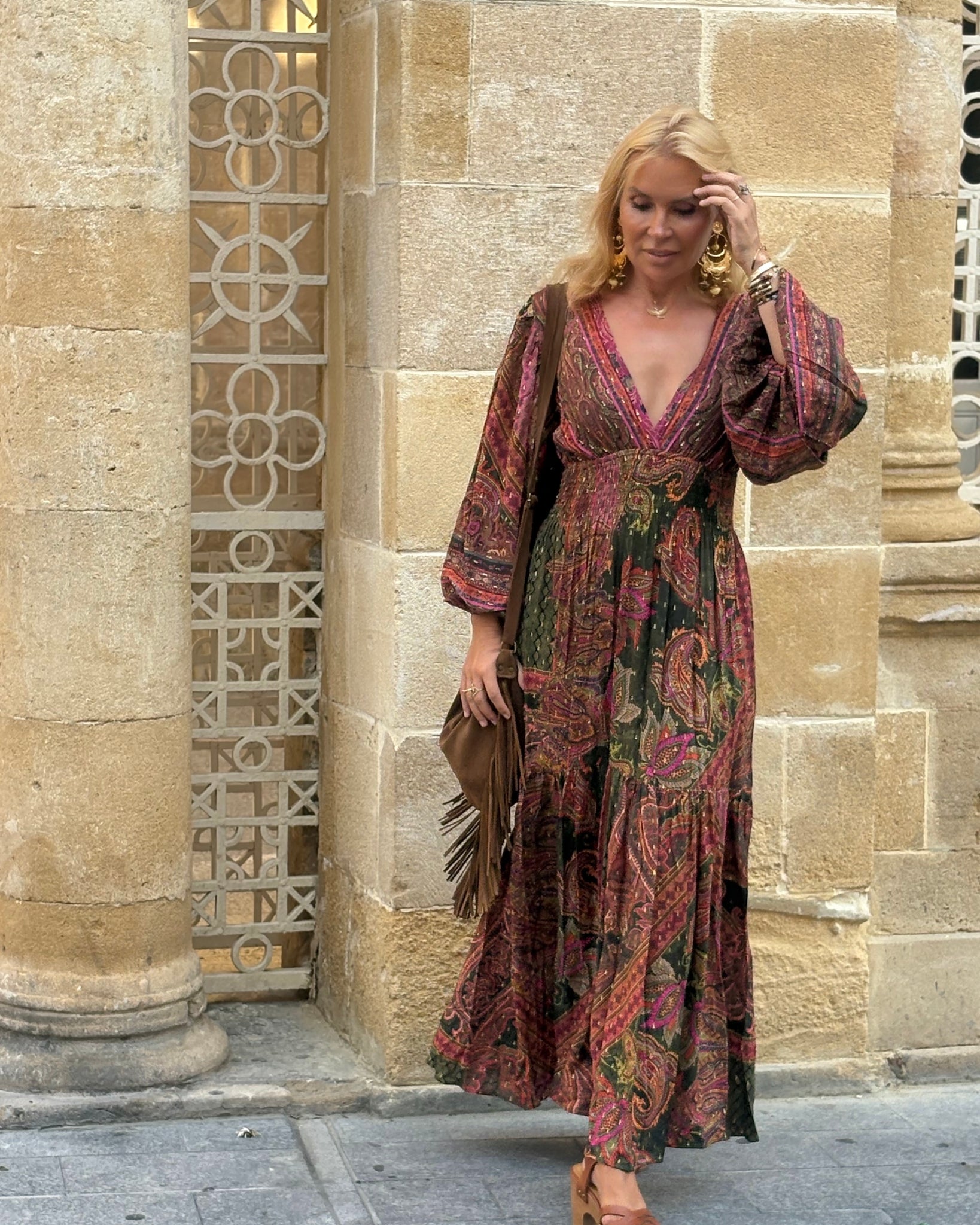 HIPPIE is s trademark design of Jaroszewska brand. Cut by hands to emphasize the beauty of the ornament of fabric. Characteristic style with a deep V neckline, high and elastic waistline, puffy, flared sleeves, slim line and flowy maxi skirt gives off a romantic , flowy look inspired by 70’s boheme chic.