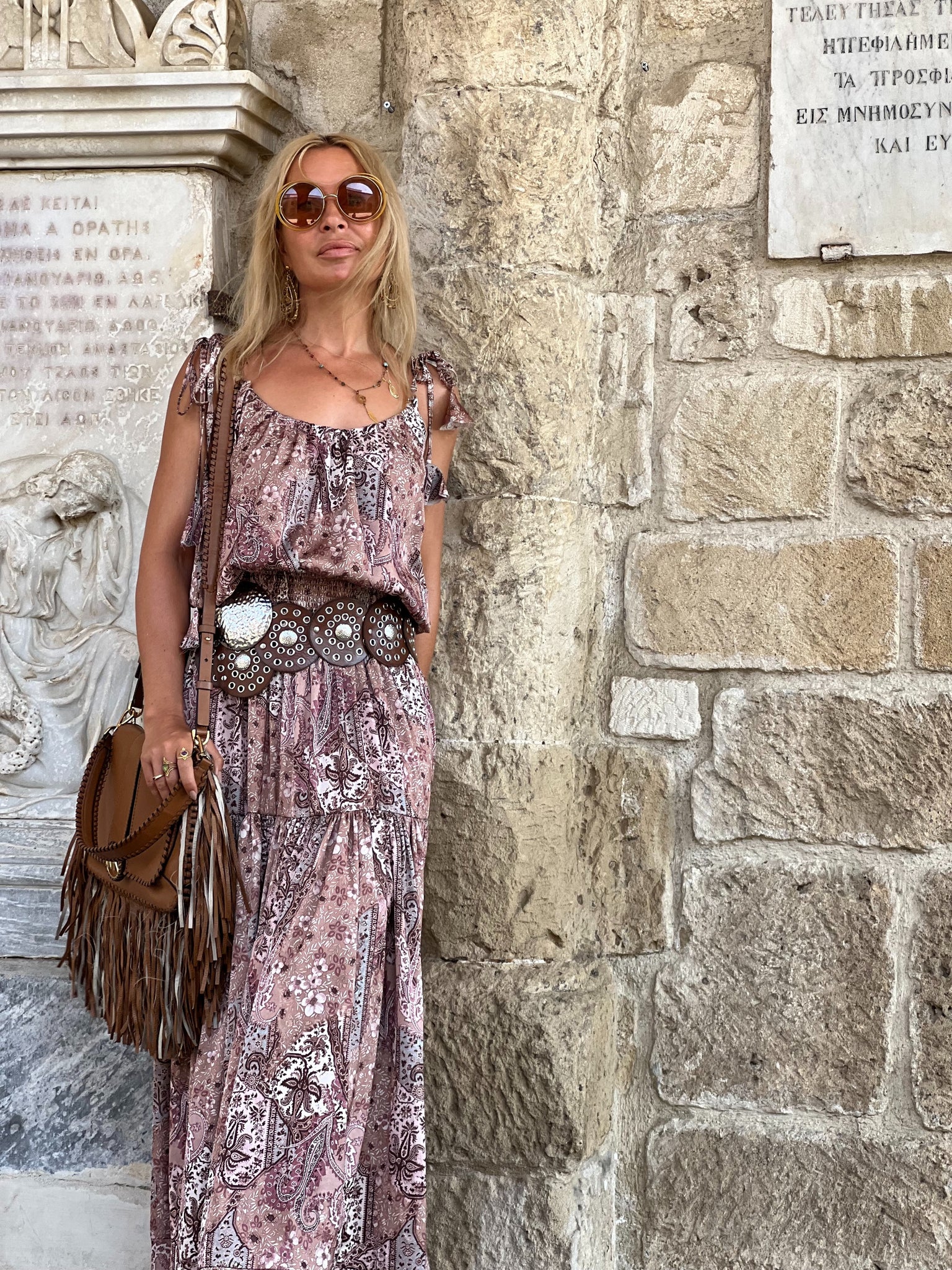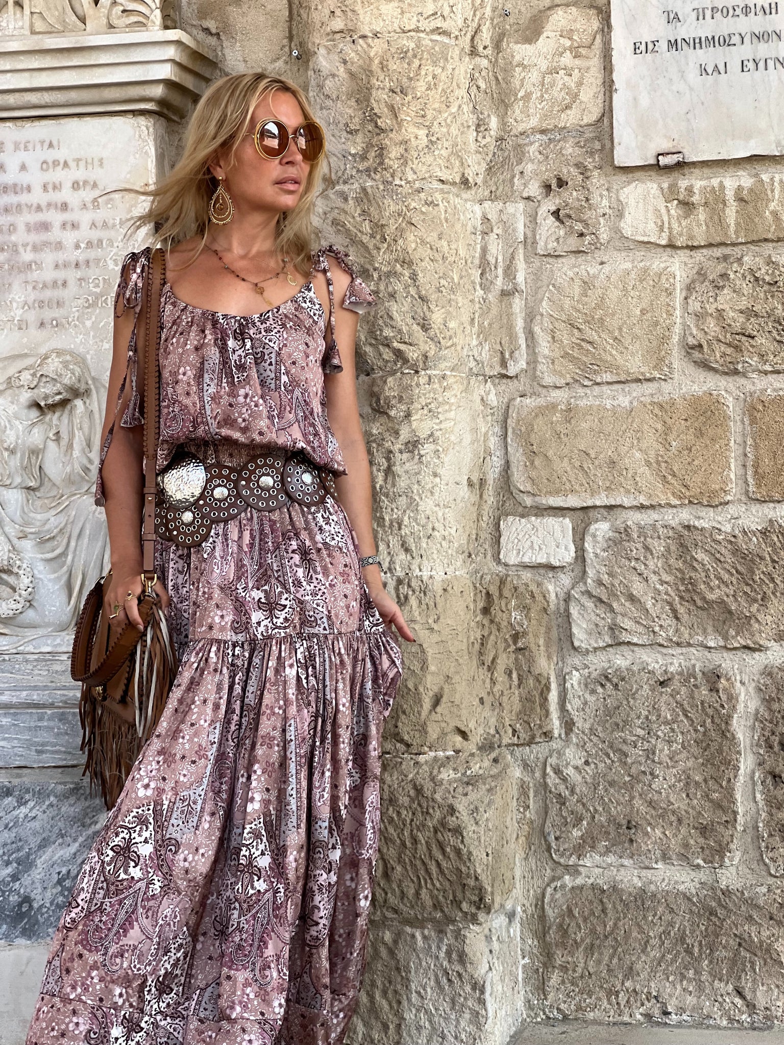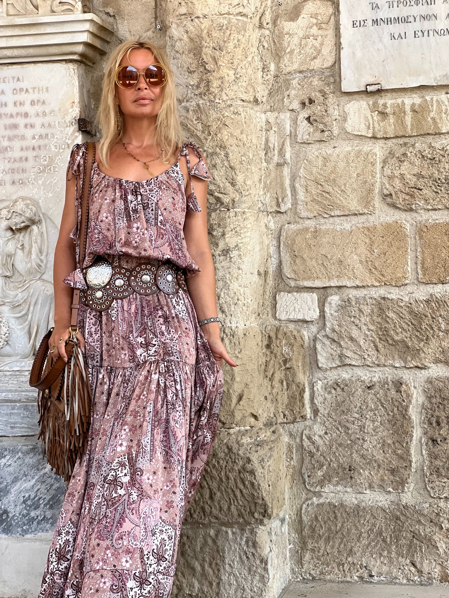 KARIATIDE MAXI DRESS/ Cafe Latte: beige+dusty rose silk
