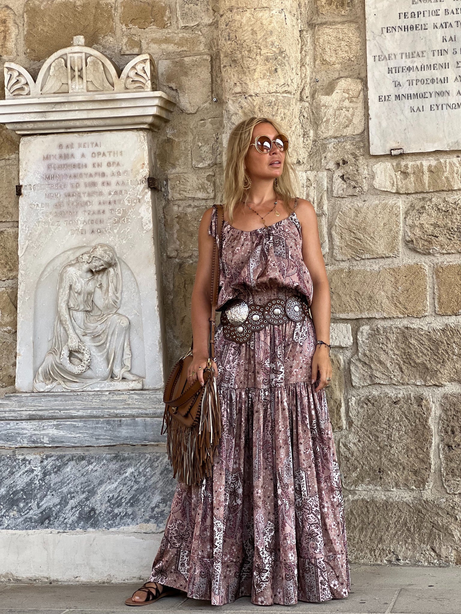KARIATIDE- sukienka maxi  w greckim stylu, na ramiączkach która urzeka harmonią proporcji wyrzeźbioną przez delikatne marszczenia. Szeroki elastyczny pas można nosić na wysokości talii lub opuścić na biodra, podobnie jak można regulować głębokość dekoltu poprzez wiązanie troczków z ozdobnymi wykonczeniami, na ramionach. Suknia pięknie rozkłada się przy każdym ruchu, dzięki bardzo szerokiej falbanie o obwodzie 4,5 metra.