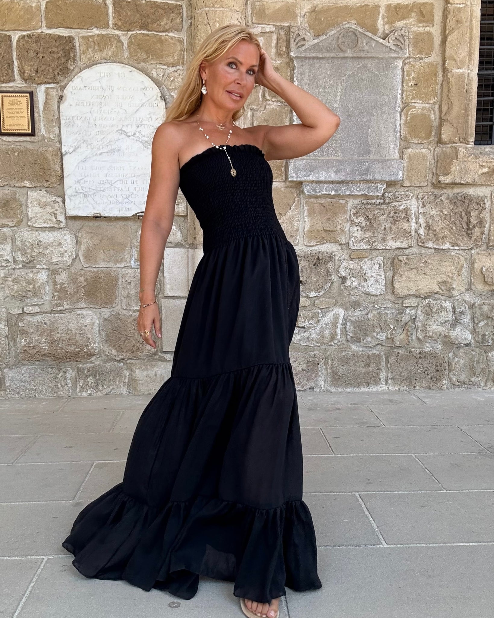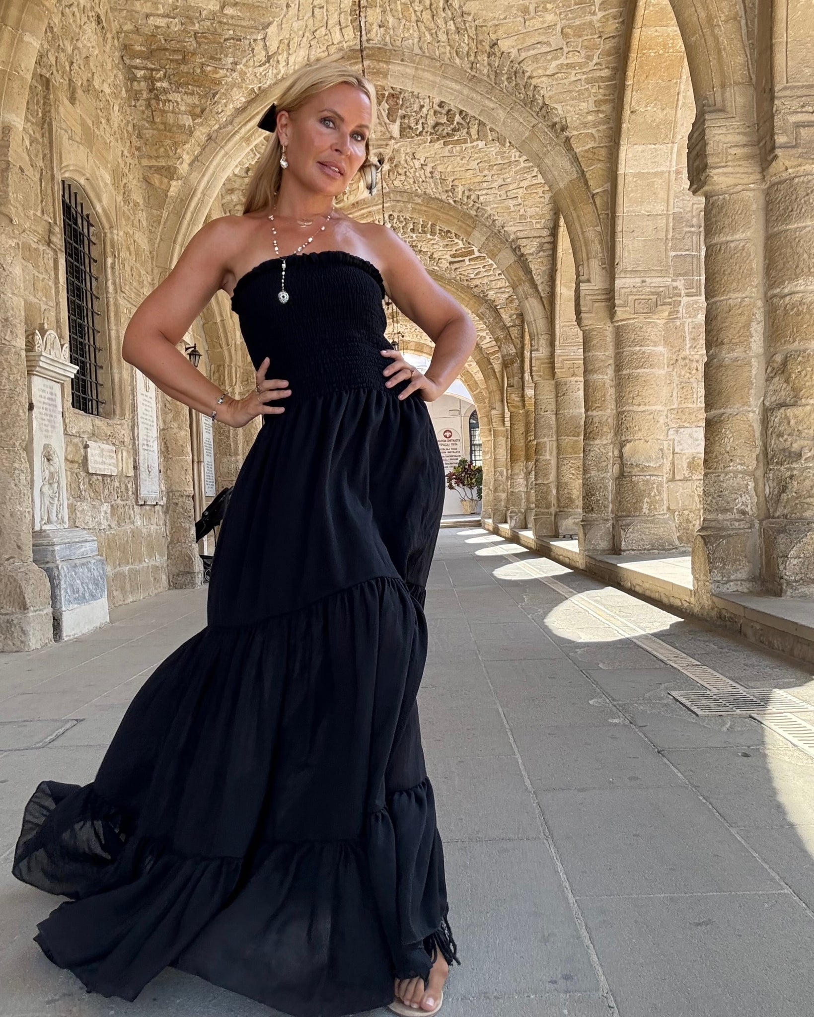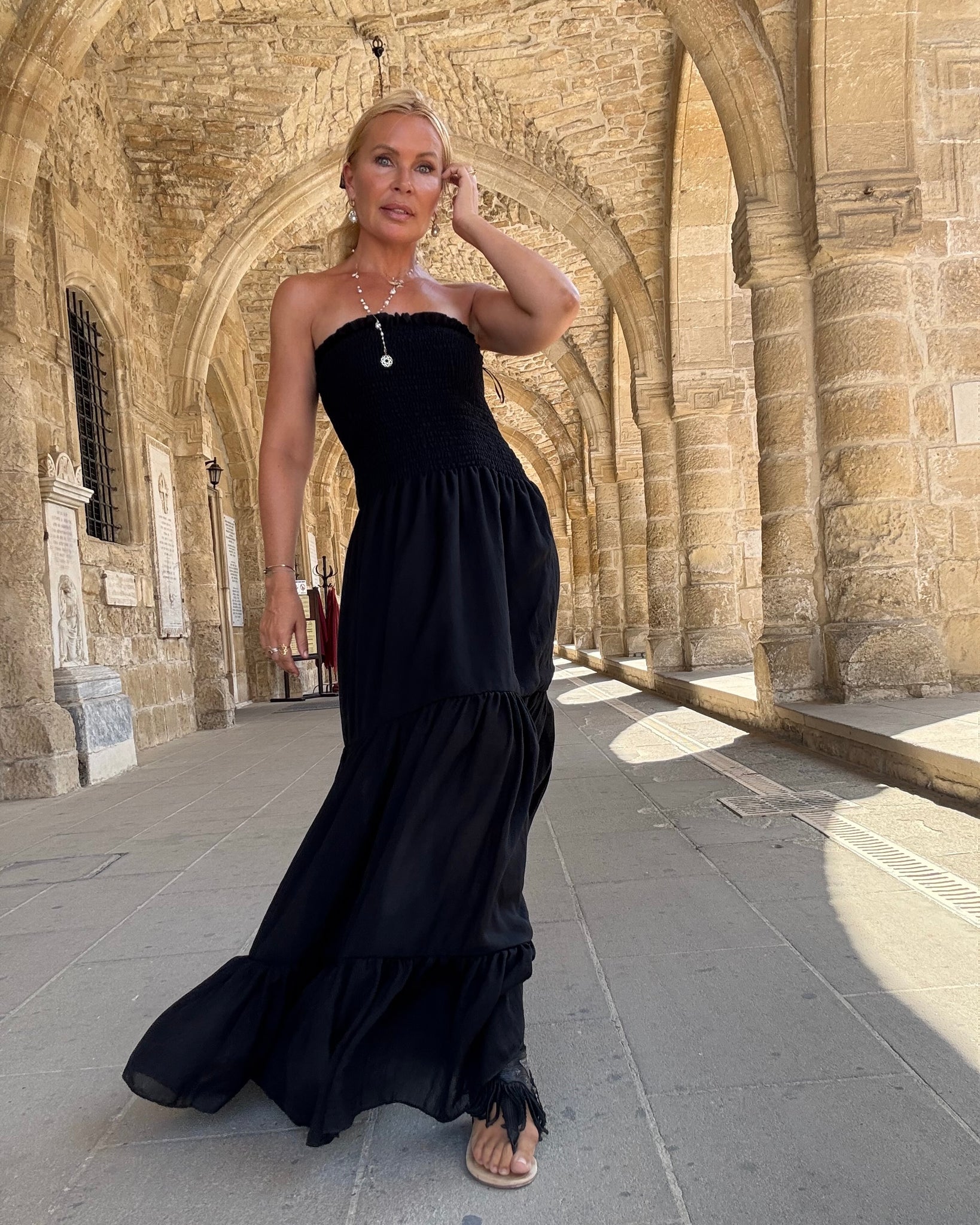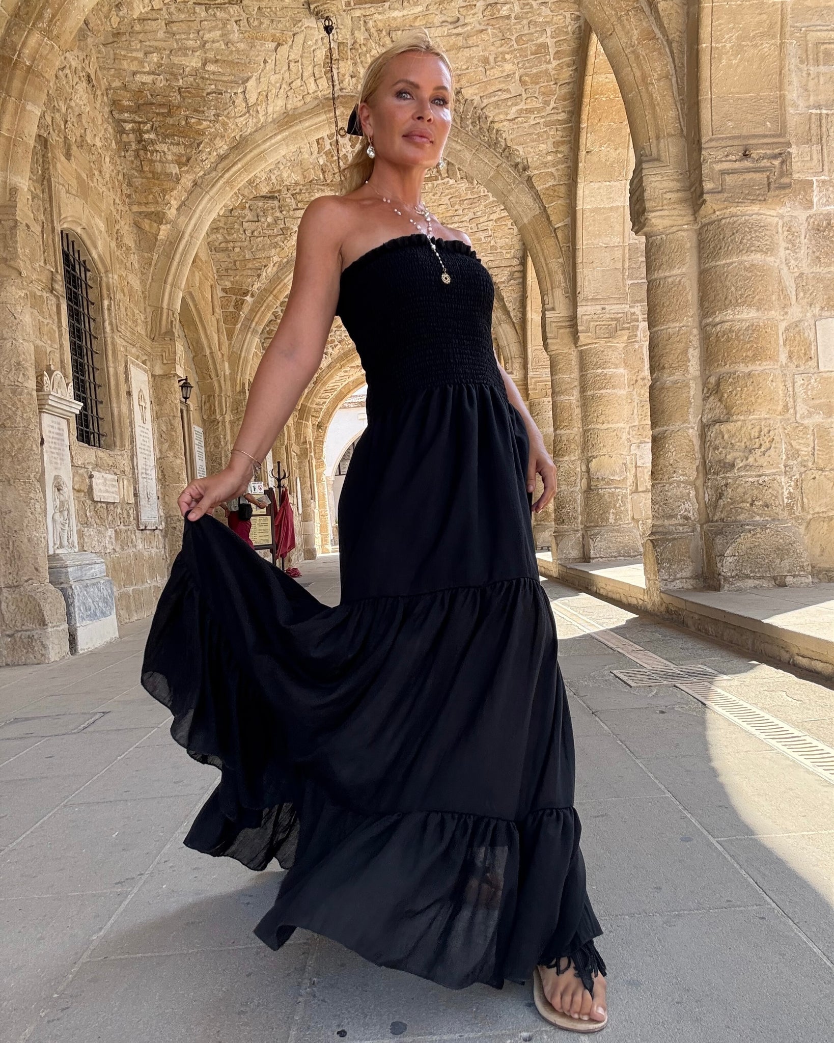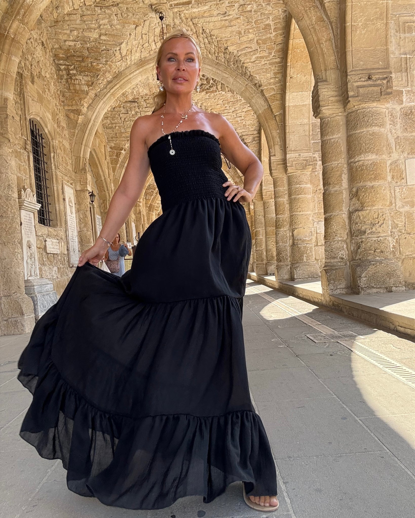 LA ISLA - a spectacular maxi strapless dress, the top of which has been sewn with elastic thread, creating a comfortable corset shaping  the body. The skirt is finished with two heavily ruffled frills that move beautifully with every movement. The last volant is 6 mtrs in circumference