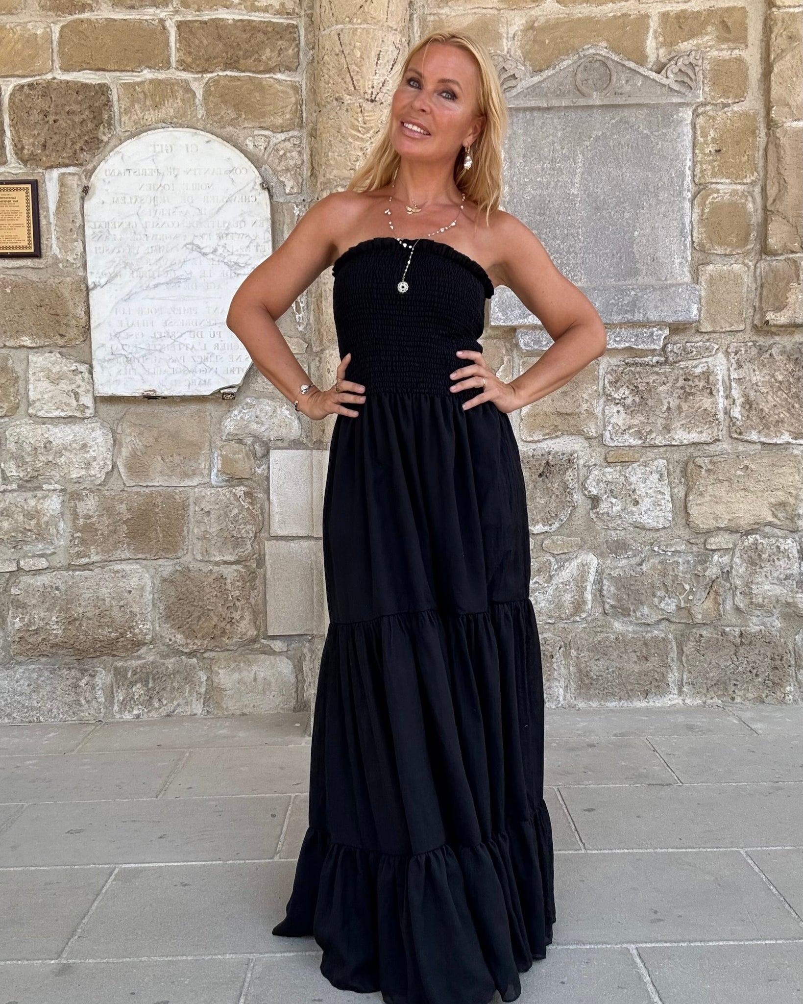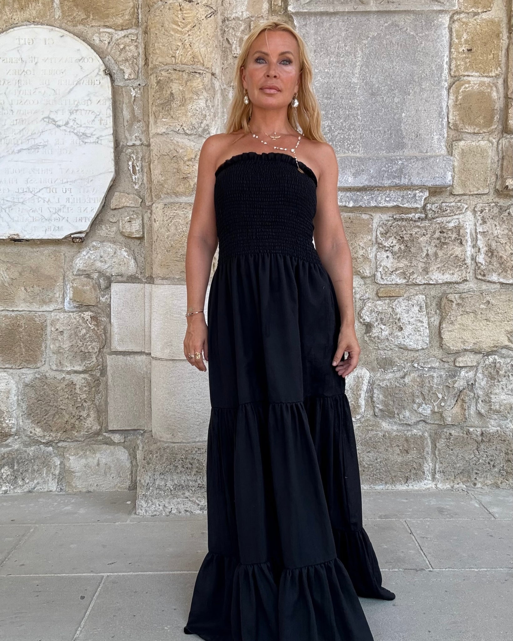 LA ISLA- spektakularna długa  sukienka bez ramiączek,  której góra została przeszyta elastyczną nicią, tworząc modelujący sylwetkę, wygodny gorset. Spódnica wykończona dwoma mocno marszczonymi falbanami, które pięknie poruszają się przy każdym ruchu. Ostatnia falbana ma 6 metrów obwodu.