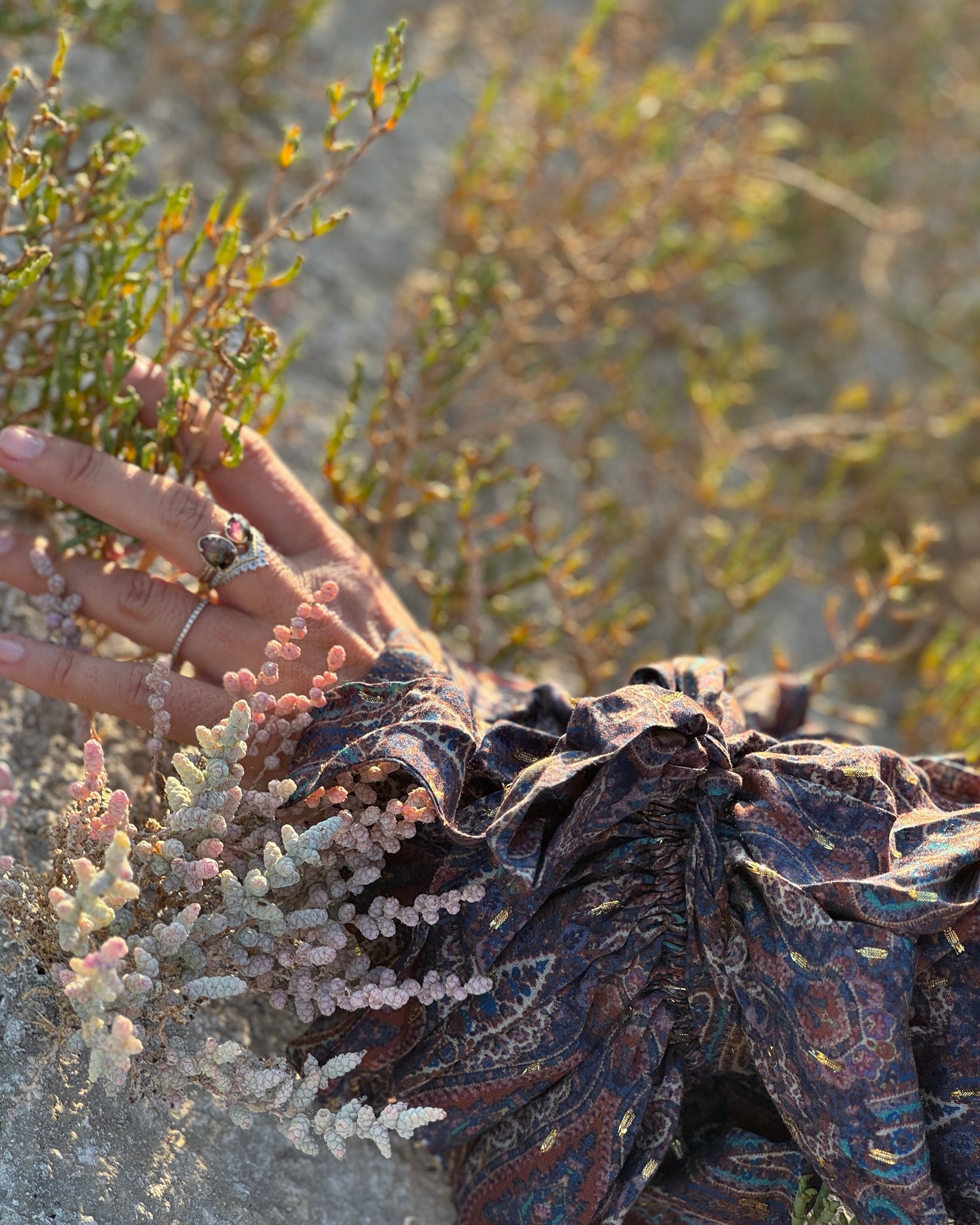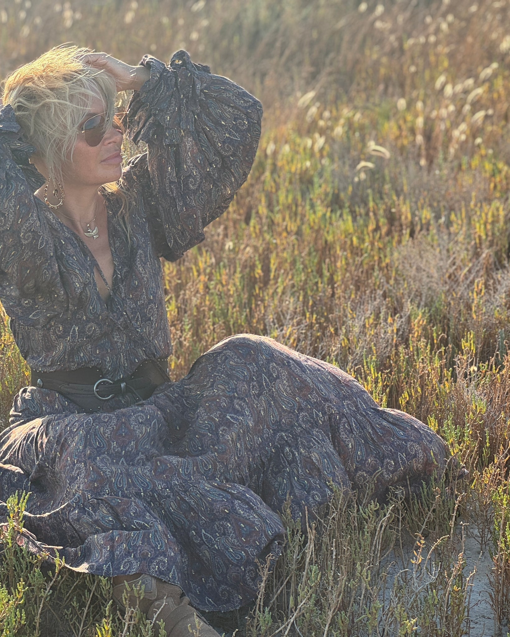 NOMAD- superkobieca sukienka boho . Karczek ma wydłużoną formę która wysmukla sylwetkę. Głębokie pęknięcie w dekolcie. Forma sukienki hest rozszerzana ku dołowi kaskadą falban, z których ostatnia ma 6 metrów w obwodzie. Marszczone rękawy z ozdobnymi mankietami wykończonymi falbaną i przewiązane kokardą.