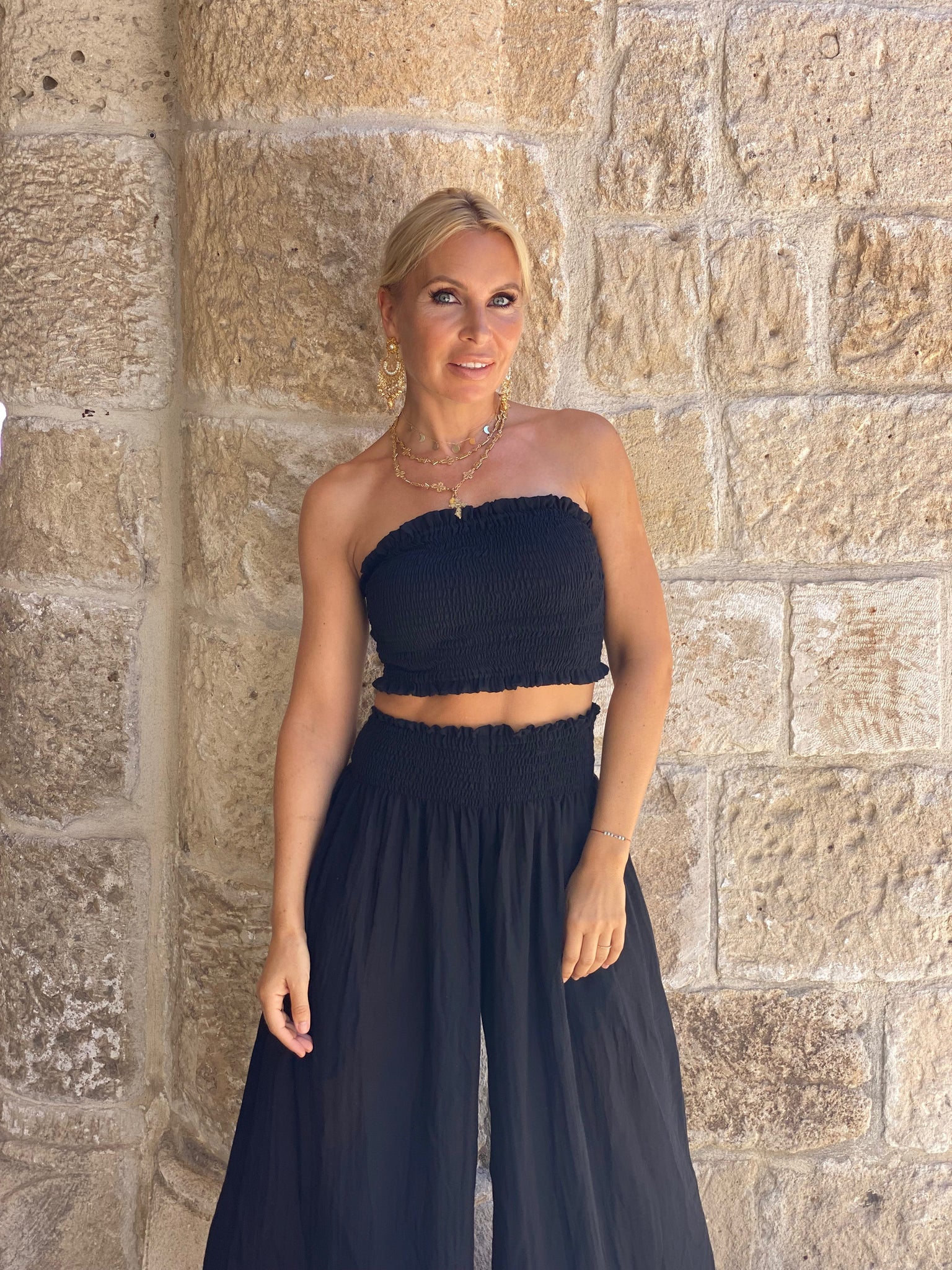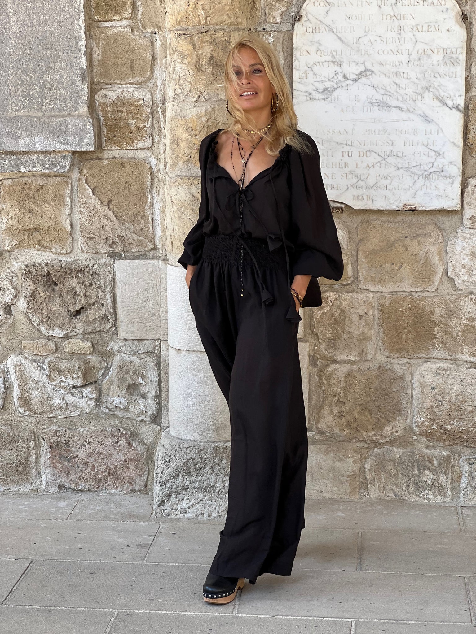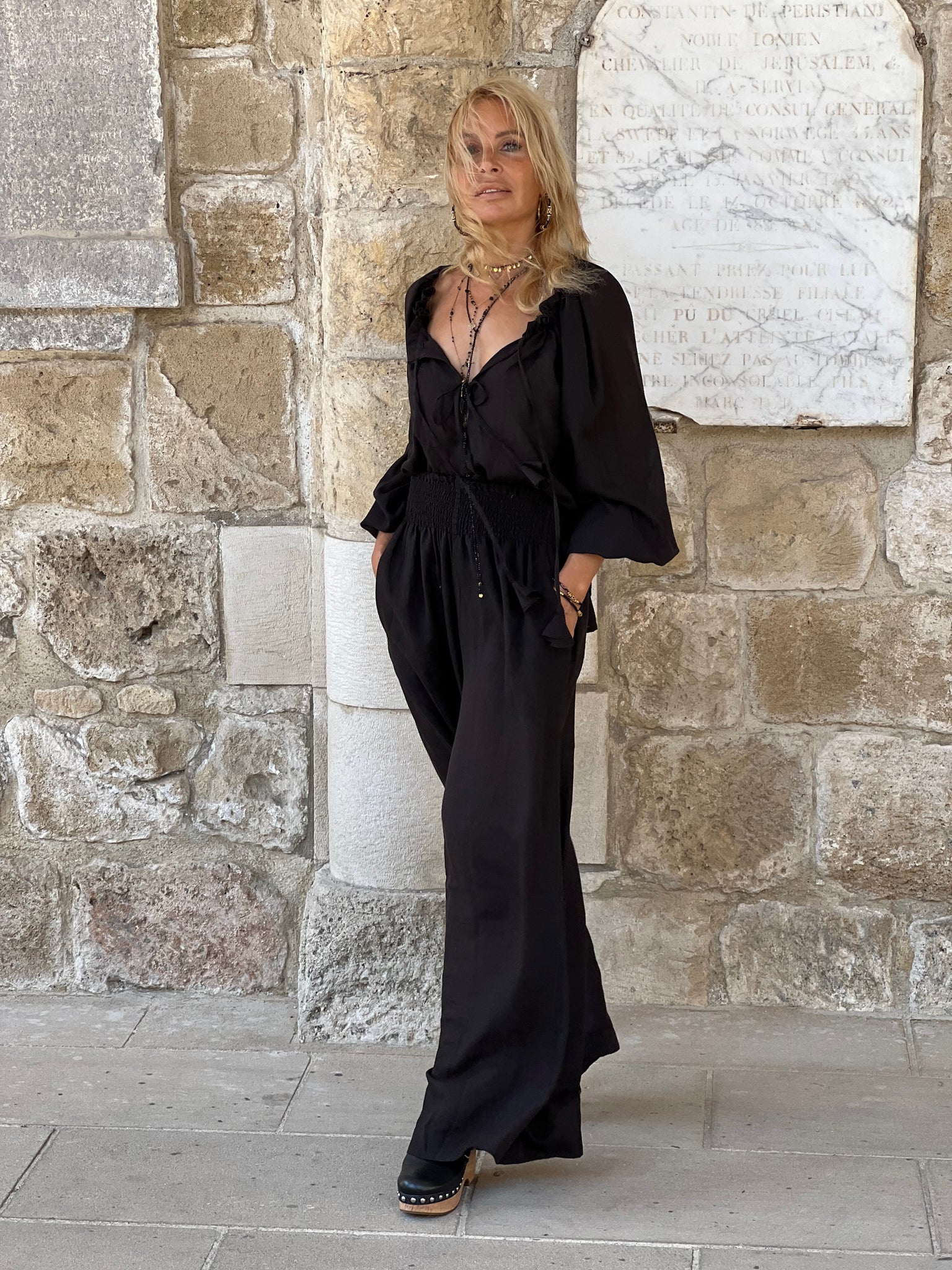 SAILOR spodnie z wysokim stanem - dzięki luźnemu krojowi z podwyższonà talià i bardzo szerokim nogawkom, mogą służyć zarówno do casualowych, jak i wieczorowych stylizacji. Nogawki mają elegancką, szeroką linię, a talia jest podkreślona szerokim, elastycznym pasem przeszytym dziesięcioma cienkimi gumeczkami. Z przodu, ukryte w fałdach marszczenia znajdujà się kieszenie, ktòre nadajà spodniom wygody i nonszalancji.