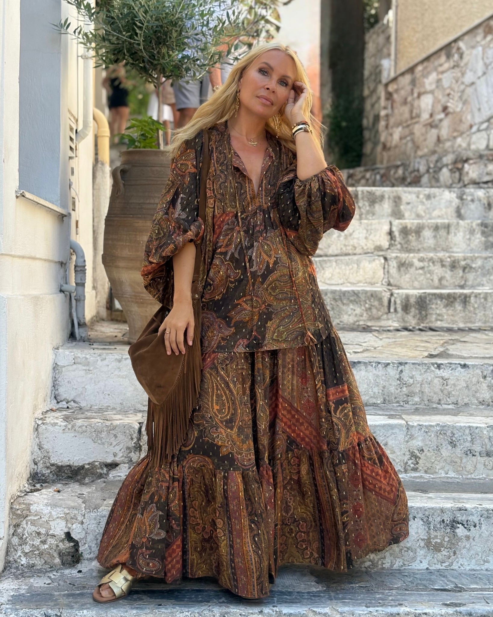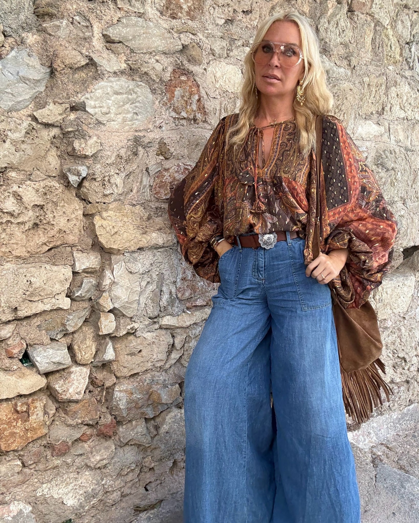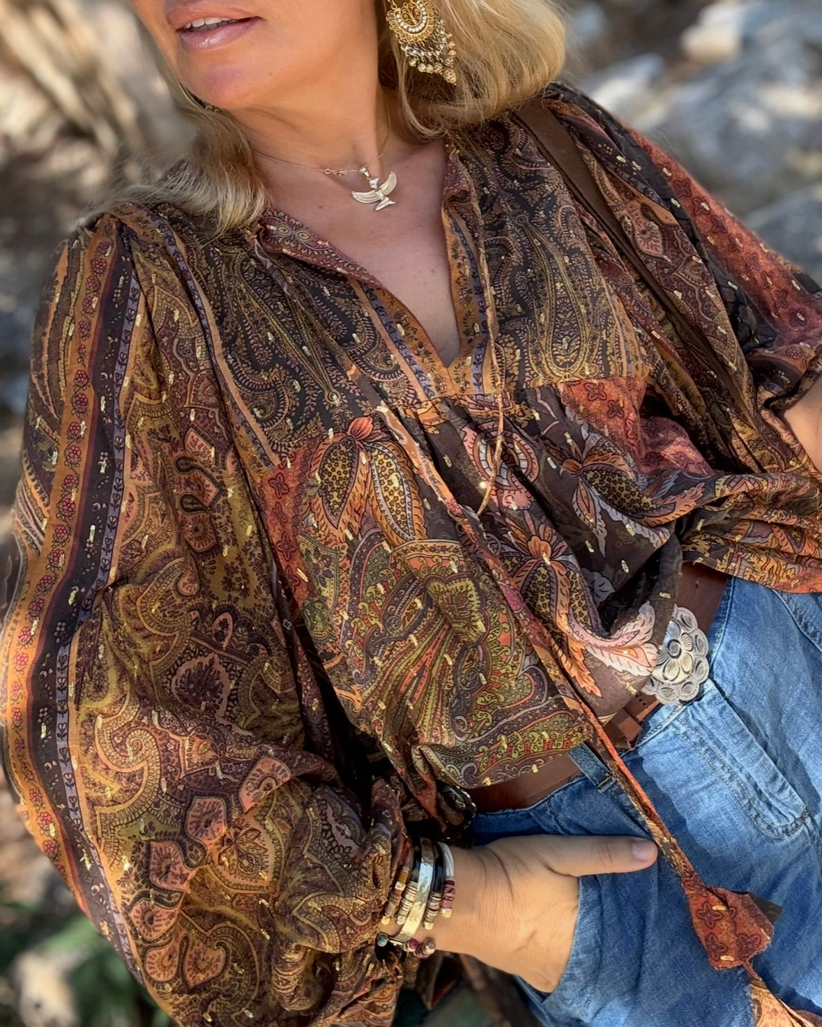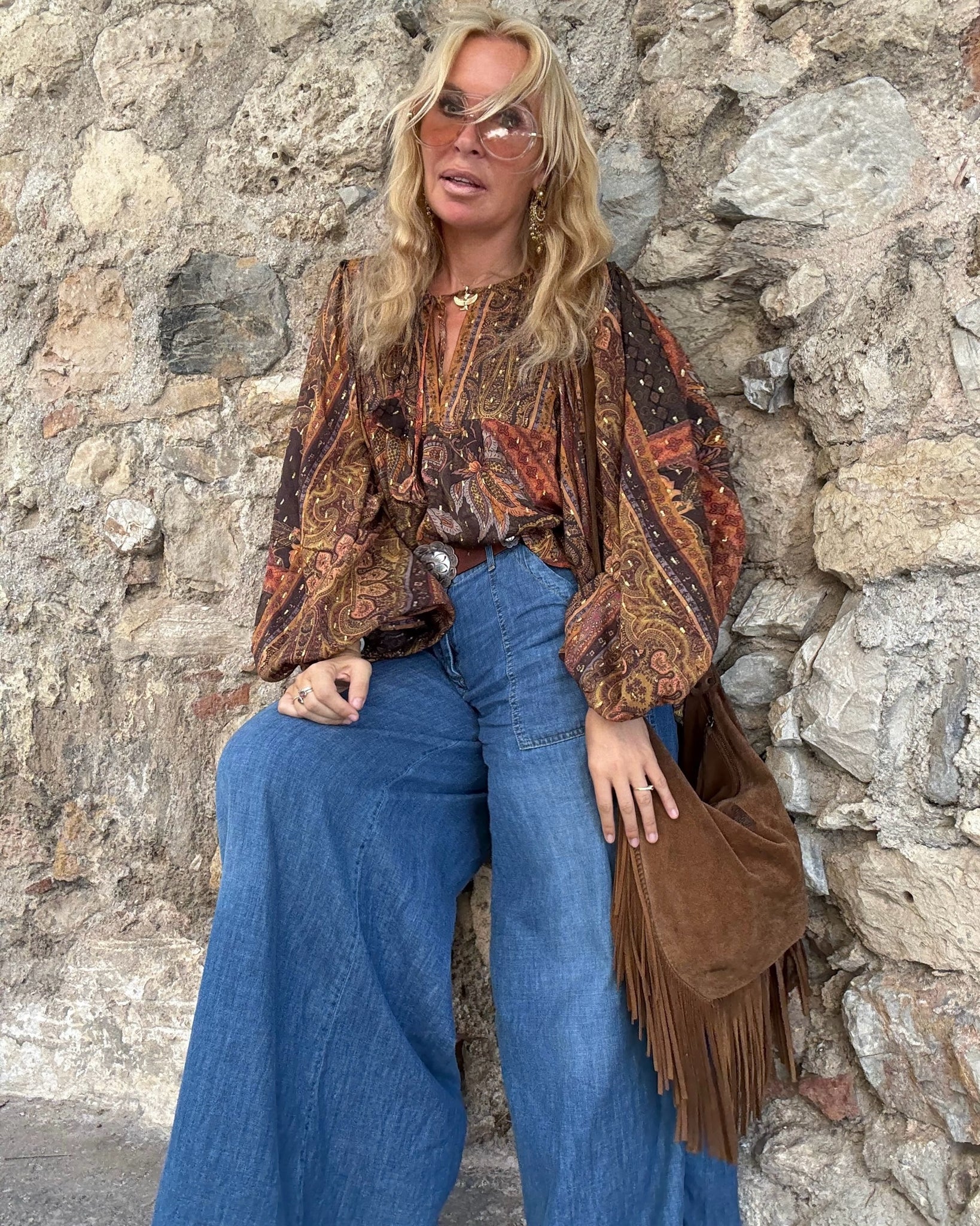 THALASSA A stylish, bohemian blouse with characteristic extra large sleeves finished with an elastic band. Square yoke at the front and back, tied at the neck with strings with hand-finished tassels. The blouse has a loose, nonchalant shape, open on the sides. looks great loose or with a belt.
