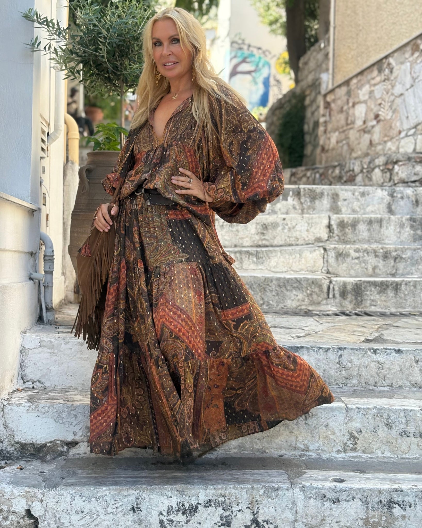 THALASSA Stylowa bluzka z charakterystycznymi bardzo obszernymi rękawami XL wykończonymi gumką. Z przodu i z tyłu kwadratowy karczek który symetrycznie podkreśla urodę wzoru , wiązany pod szyją na troczki z ręcznie wykańczanymi chwostami. Bluzka ma luźny, nonszalancki krój, z głębokimi, łukowatymi rozcięciami na bokach. prezentuje się świetnie zarówno luźna, jak i spięta paskiem.