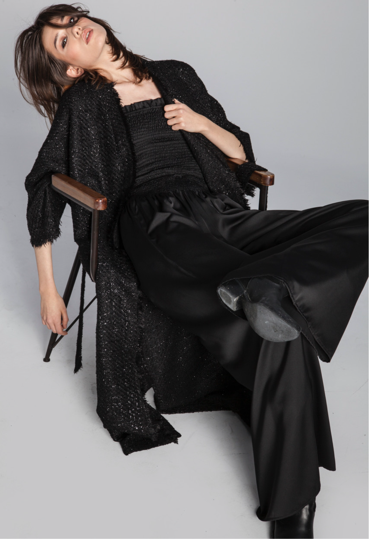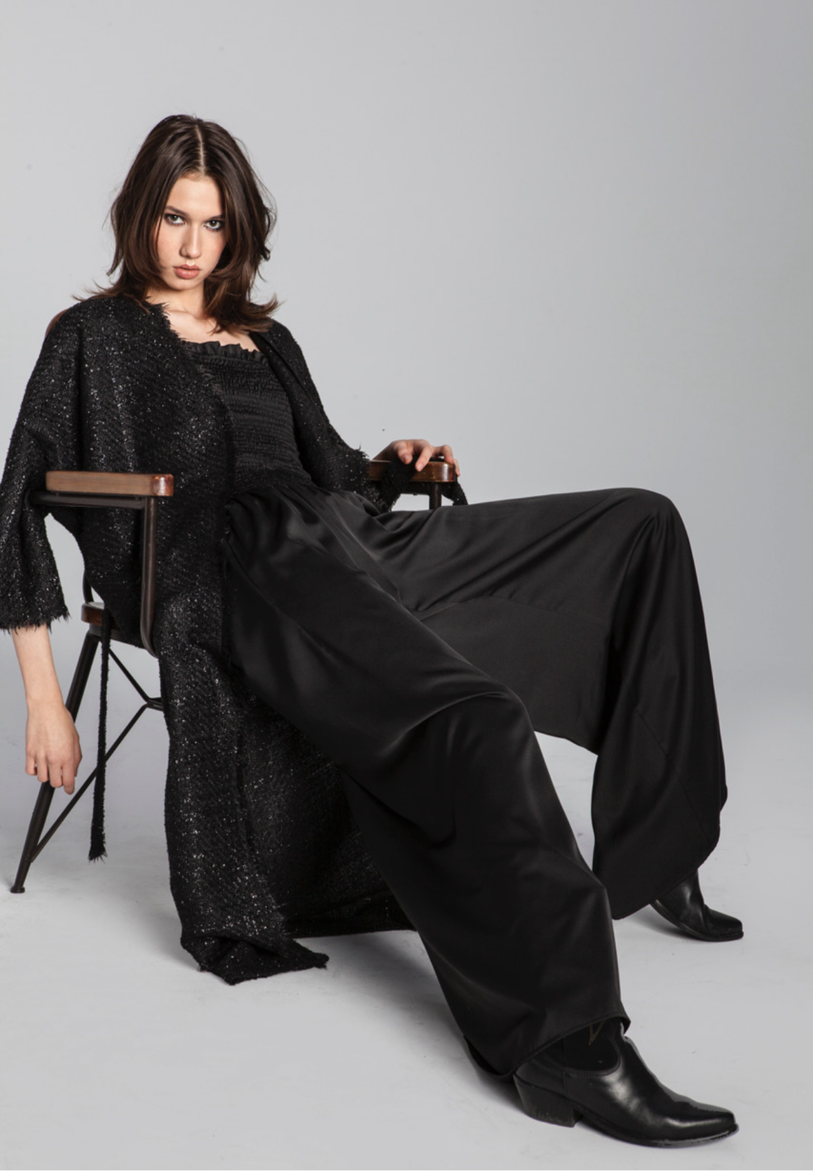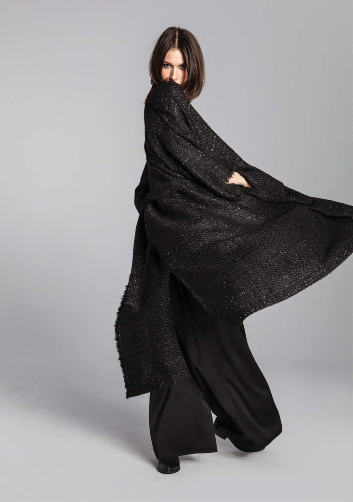Płaszcz o kroju kimona może mieć zastosowanie zarówno w stylizacjach dziennych, casualowych jak i ma wieczór. Spektakularna tweedowa tkanina w odcieniach indygo, błękitu, czerni , bieli i akcentami szarości tobi wrażenie dzięki ręcznie wykonanym wykończeniom. Boczne kieszenie. Płaszcz ma luźny krój, pęknięcia na bokach oraz pasek z tej samej tkaniny.