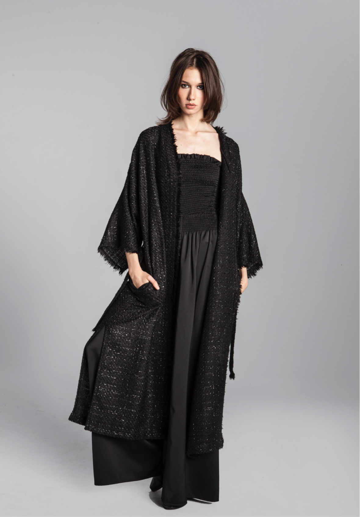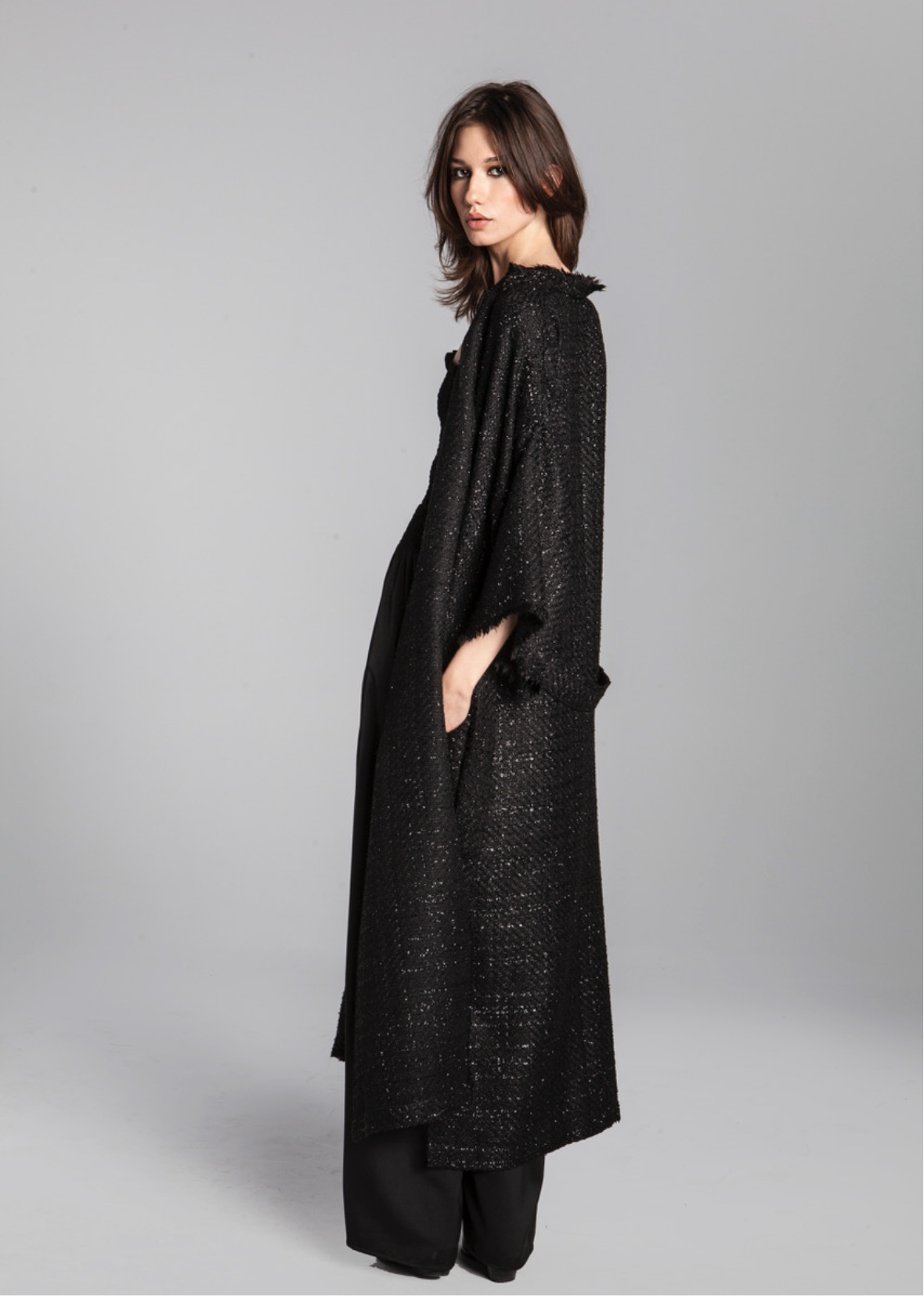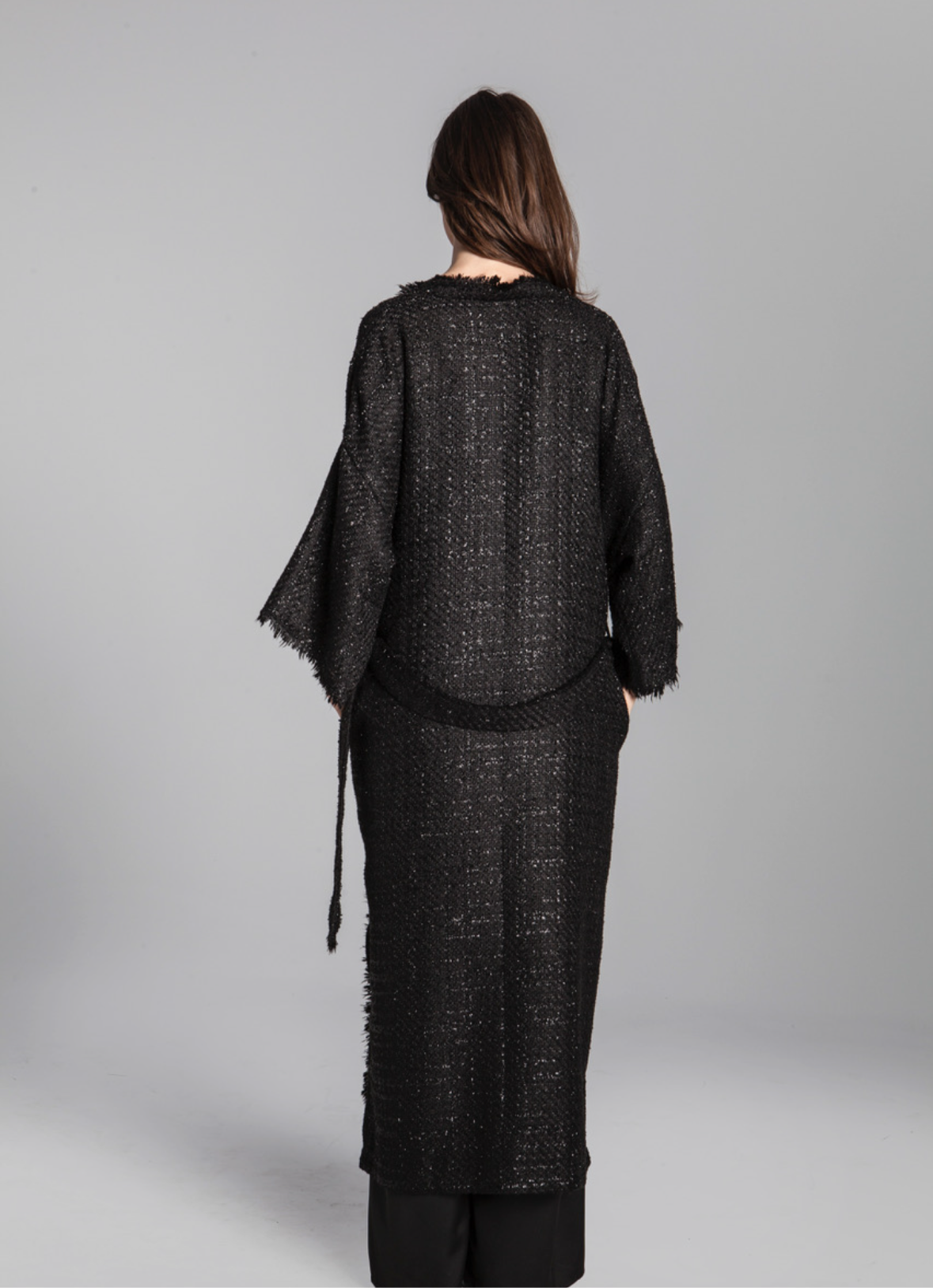 A kimono-cut coat can be used in both daytime, casual and evening styles. Spectacular tweed fabric in shades of indigo blue, black, white and grey accents makes an impression thanks to hand-made finishes. Side pockets. The coat has a loose cut, splits on the sides and a belt made of the same fabric.