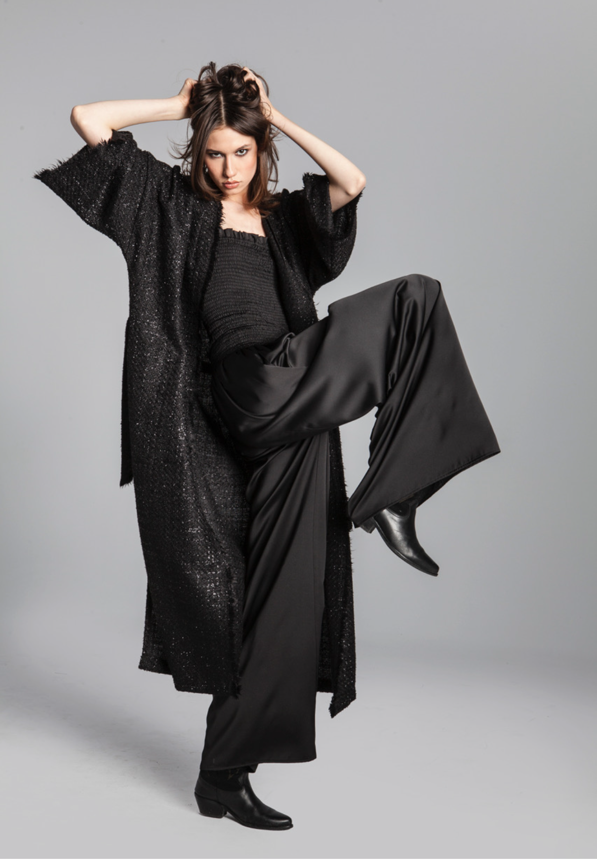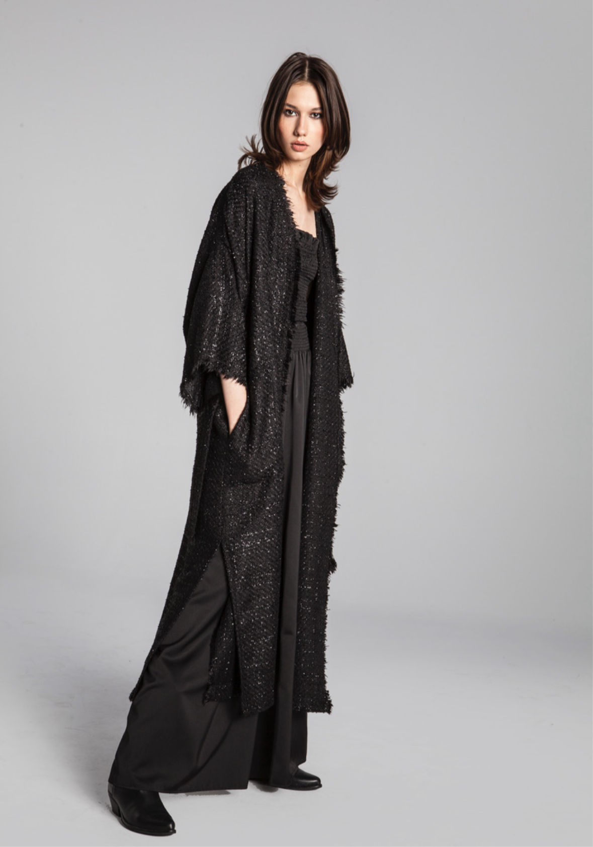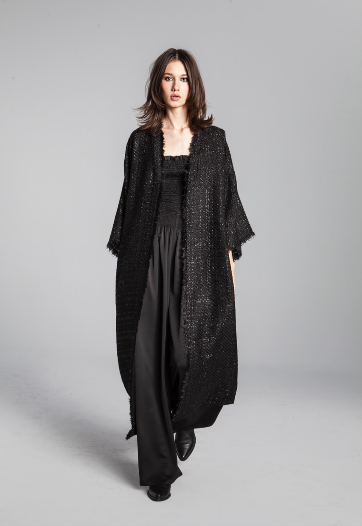A kimono-cut coat can be used in both daytime, casual and evening styles. Spectacular tweed fabric in shades of indigo blue, black, white and grey accents makes an impression thanks to hand-made finishes. Side pockets. The coat has a loose cut, splits on the sides and a belt made of the same fabric.