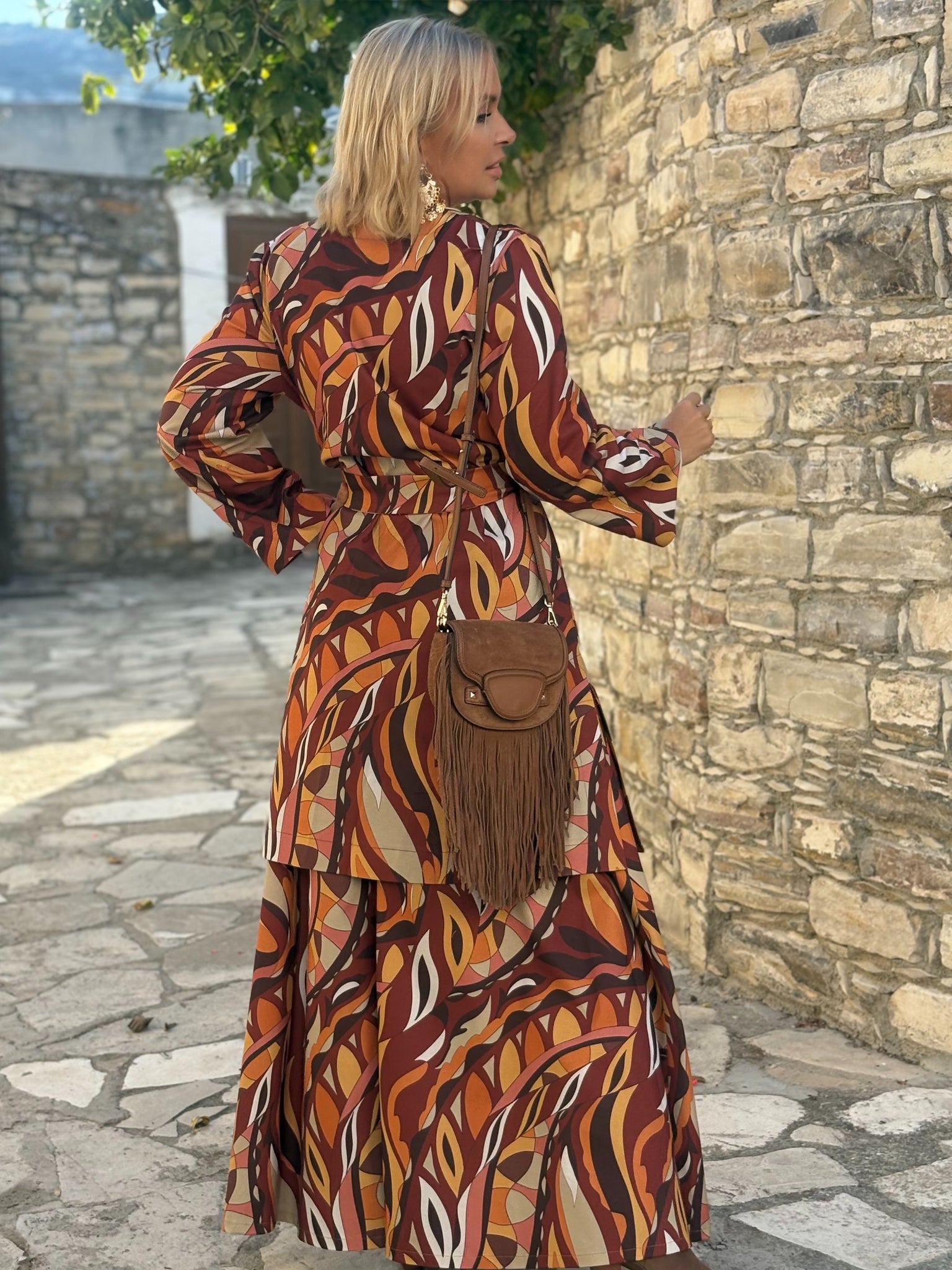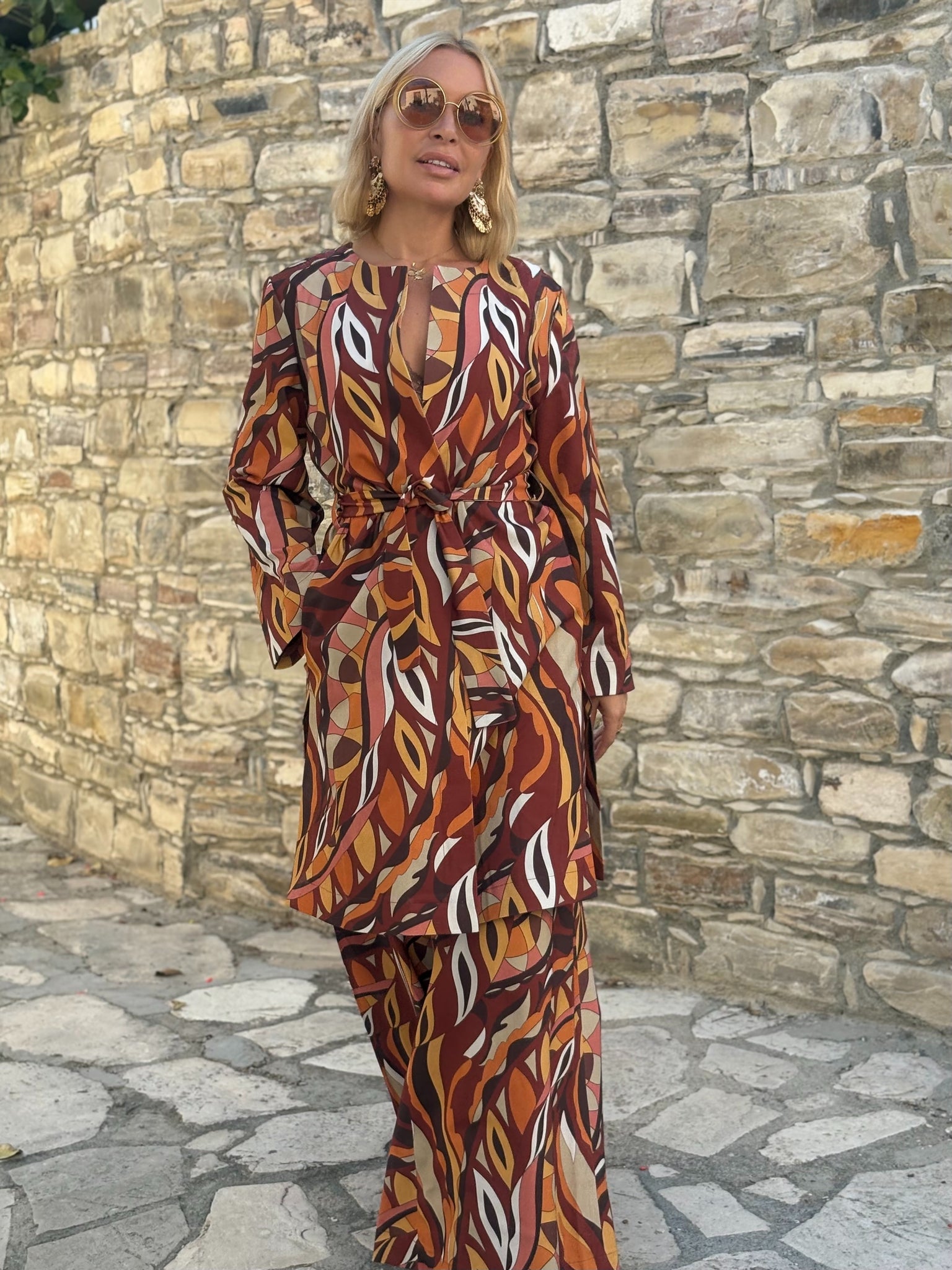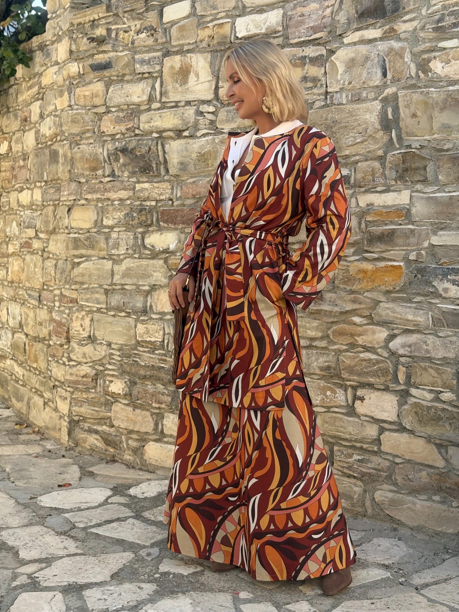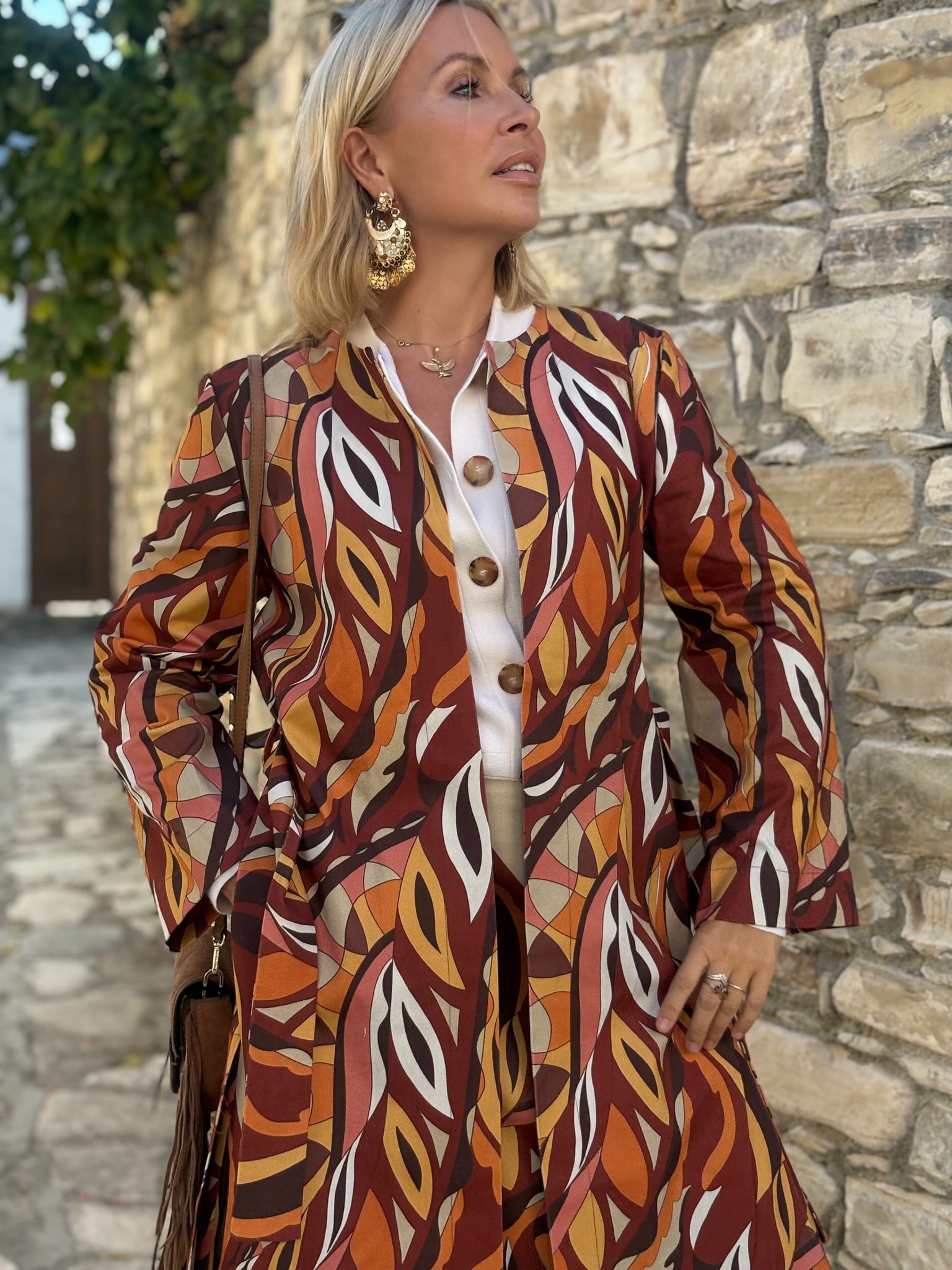 Klasyczny przedłużony żakiet pudełkowy inspirowany modą lat 60tych. Minimalistyczny krój podkreśla spektakularny stylowy wzór tkaniny. Jeansowa, lekko sztywna tkanina pięknie trzyma fason i nie potrzebuje podszewki. Okrągły dekolt bez kołnierza. Brak zapięcia, wiązanie w talii na pasek który podkreśla talię. Boczne kieszenie. Ozdobne pęknięcia na bokach wysmuklają linię płaszczyka.