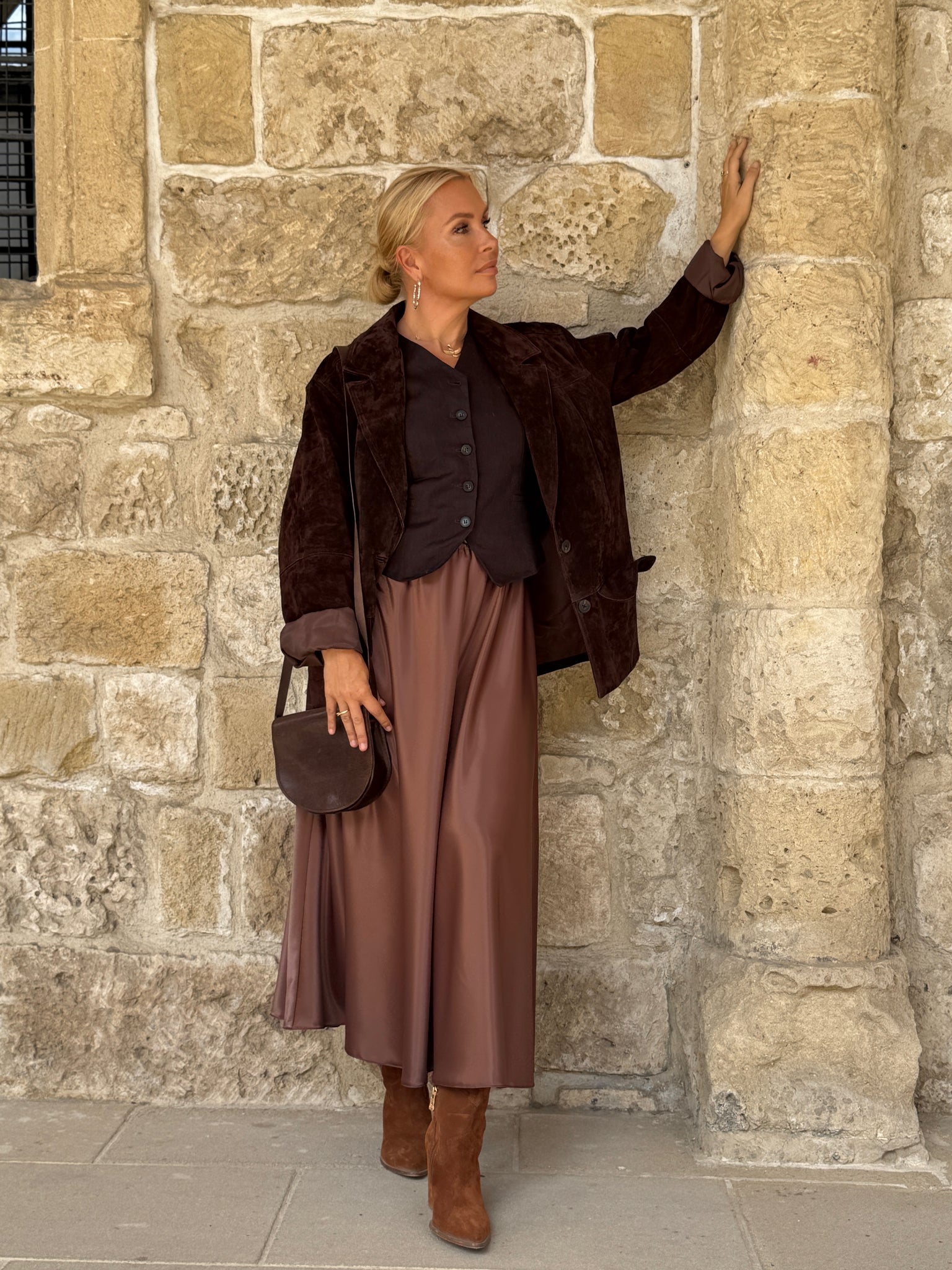 Spódnica perfekcyjnie wykrojona z pòłklosza, dzięki czemu pięknie układa się przy każdym ruchu, załamując światło. Aby ułatwić dopasowanie do sylwetki , w talii ma gumkę zamiast zamka błyskawicznego, dzięki czemu jest bardzo wygodna na co dzień. Satynowa spòdnica to element gatderoby perfekcyjny zarówno do casualowych miejskich stylizacji, jak i na wieczorowe wyjścia.